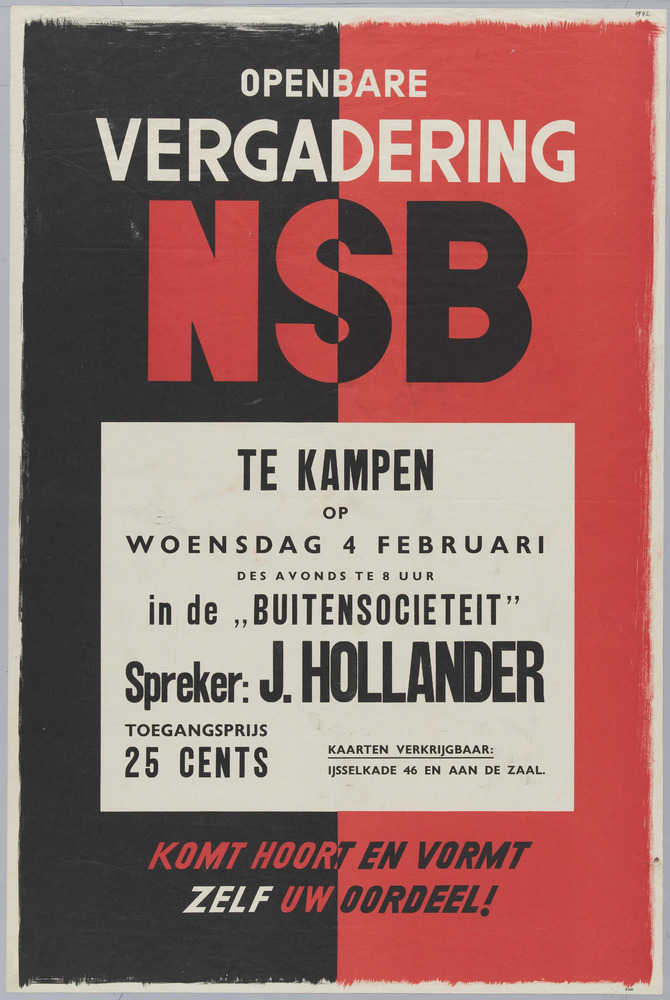 Openbare Vergadering van het Nederlands Verbond van Vakverenigingen. Woensdag 1 october in zaal Harmonie. Spreker A.
