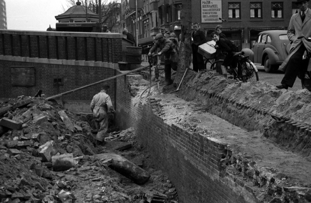 Het slopen van de Heulbrug over de Schie, locatie Schieweg / Schiekade, bij het dempen van de Schie.