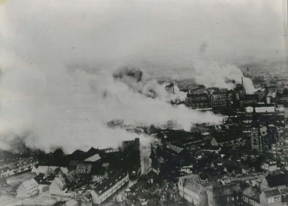 AD - B 14 Geallieerde acties Daylight attack on Philips Works, Eindhoven Remarkable photographs were taken during the attack by nearly 100 light bombers of the R.A.F. on the important Philips radio valve works at Eindhoven Holland on Sunday 6-12-1942.The attack was extremely concentrated the bombers unloading all their high explosives and incendiary bombs within a few miniutes of reaching the target area, which was 60 miles from the Dutch coast. On their return pilots and crews reported that the attack appeared to have been highly successful: these reports are substantiated by the photographs taken at the time. As the last of the bombers roared over, the target area was almostly completely obcured by smoke.