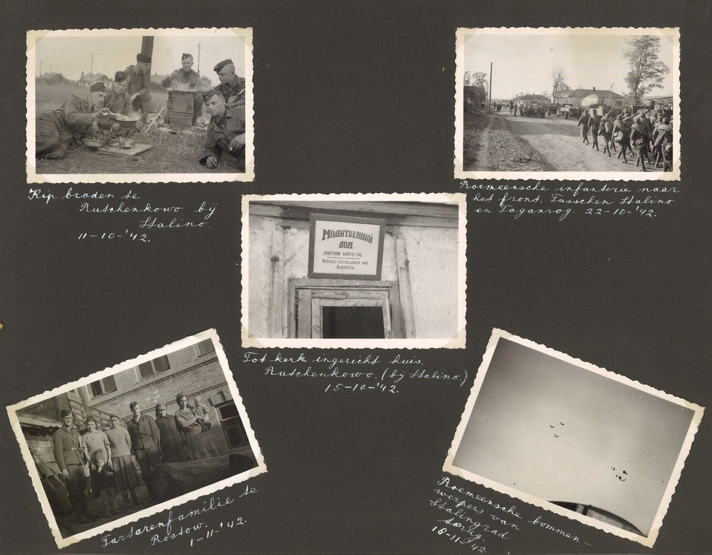 Pagina uit het fotoalbum van J.C. Beekhof. Beekhof wordt voor de oorlog lid van de NSB en maakt later deel uit van de Mussertgarde. Als lid van de WA volgt hij een opleiding in België aan de Motorschool en vertrekt naar Duitsland. Uiteindelijk komt Beekhof aan het Oostfront in de Sovjet Unie terecht, tot en met maart 1943. Af en toe is hij terug in België en Nederland. In april 1943 gaat hij met verlof in Nederland. Hier eindigt het album. Dorp: Dolhinow. Rusland. Aug. '41. Dirk schrijft weer eens. 'Dorpsgezicht in Rusland Aug. '41. Vernielde brug te Witebsk. (Rusland) Arbeiders woningenin het Sowjet-Paradijs. Witebsk, Aug-Sept. '41.