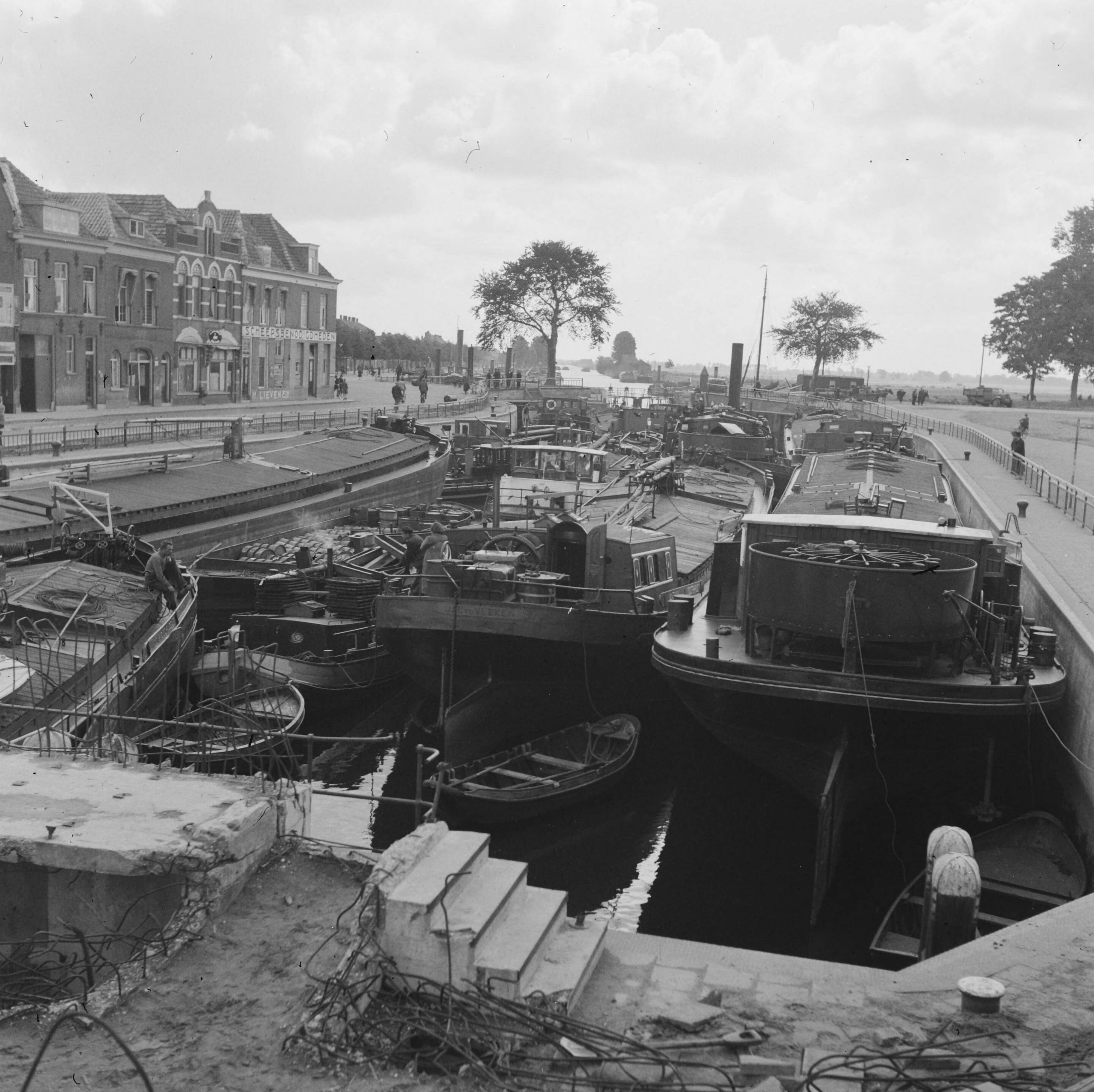Herstelwerkzaamheden aan het noordelijke sluishoofd van Sluis 16 in de Zuid-Willemsvaart te Weert na de beschadigingen in mei 1940.