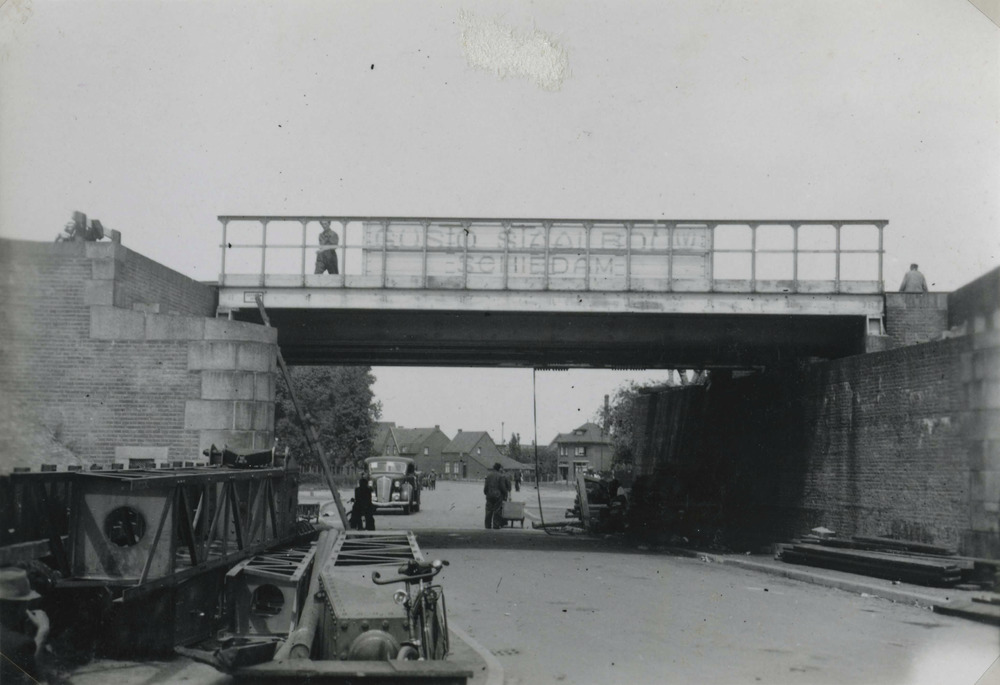 Werknemers van Gusto Staalbouw op een op balken opgevijzeld deel van de spoorbrug met een reclamebord van het bedrijf aan de railing van de brug Foto uit een album met 114 foto's betreffende de werkzaamheden door Gusto Staalbouw aan diverse in 1940 vernielde dan wel verwoeste objecten zoals spoor- en verkeersbruggen en een sluis. De werkzaamheden aan de spoorbrug Moeselbrug en Sluis No. 16 in de Zuid-Willemsvaart bij Weert en aan de twee spoorbruggen (kanaal Wessem-Nederweert) en de verkeersbrug in Kelpen worden uitgebreid in beeld gebracht.