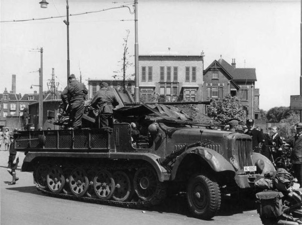 Duitse bezettingstroepen in een legervoertuig voor het Postkantoor aan de Nieuwezijds Voorburgwal in Amsterdam.