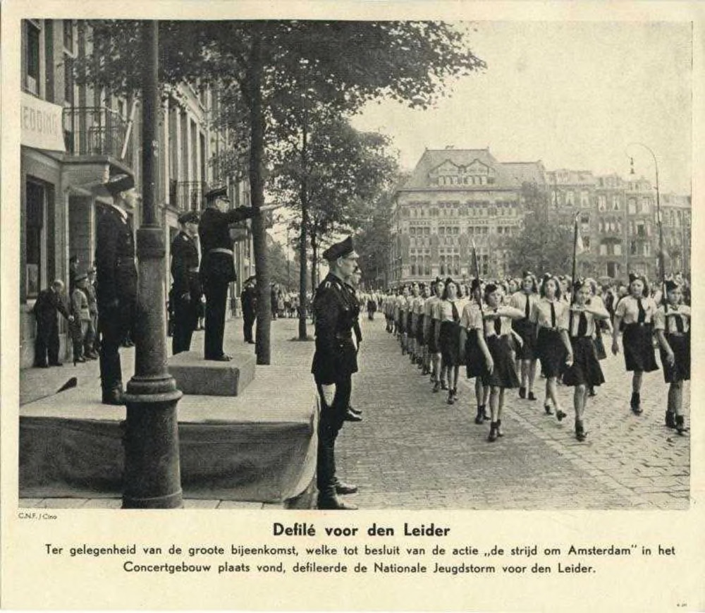 Vergadering van de NSB over de komende actie: 'Strijd om Amsterdam' . Motto: 'Gij zijt niets: uw volk is alles'. Spreker is Frentrop. Met de leus: “ Ons nationalisme uw redding, ons socialisme uw toekomst” voerde de NSB gedurende drie maanden de actie “ De Strijd om Amsterdam” , van 04-03-1944 tot en met 15-06-1944. Cino, G.H. 1894 – 1967. Cino werkte sinds midden jaren ’20 voor Het Leven. In december 1940 was Cino lid geworden van de NSB. Het Leven werd eind 1941 opgeheven en in juli 1942 krijgt Cino een baan bij de Fotodienst der N.S.B. Zijn foto’s verschijnen in Volk en Vaderland, Fotonieuws, de Zwarte Soldaat en Storm SS. Op 28 mei 1945 werd hij gearresteerd.