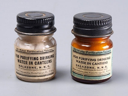 Twee glazen potjes met waterzuiveringstabletten, 50 stuks (volgens etiket) in glazen flesje