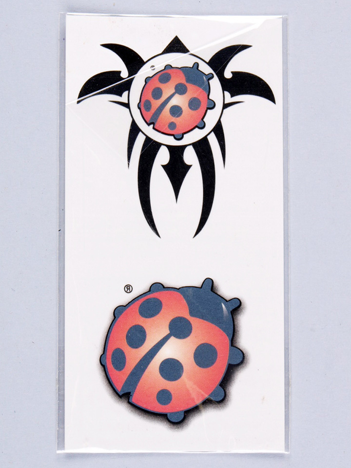 Plak tattoo van een lieveheerbeestje. Kado bij weekblad Break Out. www.zinloosgeweld.nl