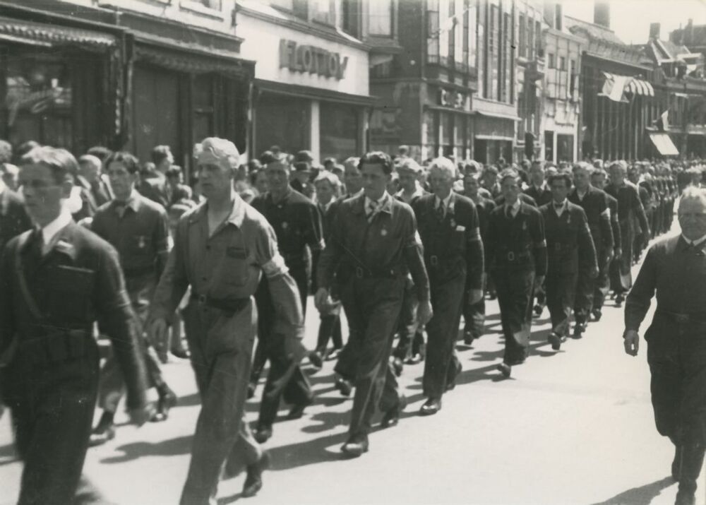 Op 13 mei 1945 was er een grote 'Churchparade' door de Friese hoofdstad ter gelegenheid van de dankdienst van Canadezen en verzet in de Grote Kerk. De parade werd afgenomen door de Canadese kolonel H.G. Sandercock samen met Nederlandse autoriteiten. De dienst stond onder leiding van legerpredikant Andrews en de hervormde ds. G. Gerbrandy. Het thema was: 'Hij is onze vrede'. Hier ziet men de N.B.S. de Sint Jacobsstraat inlopen.