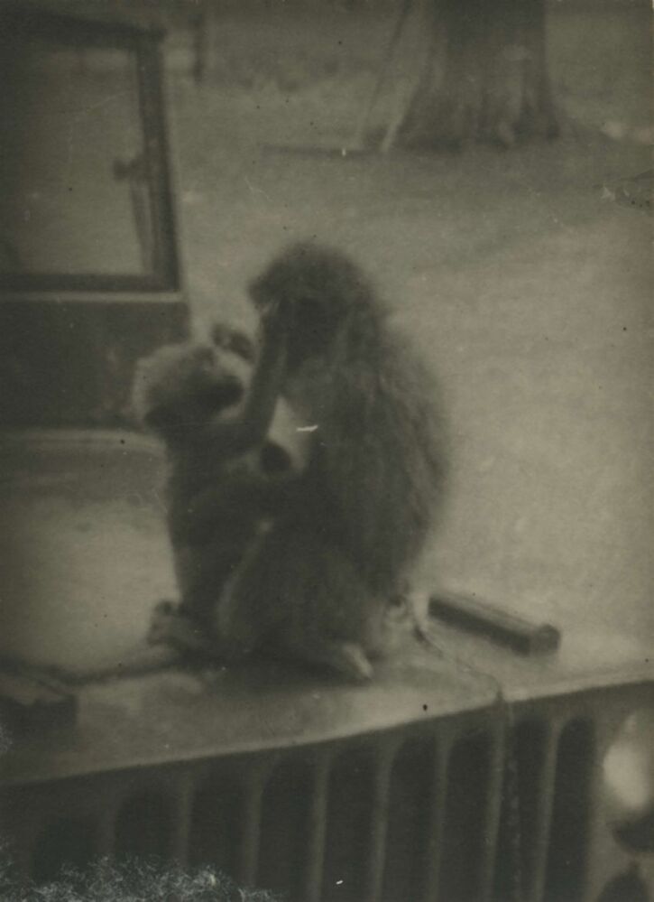 Deze opname is afkomstig uit een serie die het dagelijkse leven van het Bataljon Friesland laat zien. Deze twee aapjes vermaken zich uitstekend. Op 26 oktober 1945 hield het Bataljon Friesland haar afscheidsparade op het Wilhelminaplein te Leeuwarden. De lange en verre reis naar Nederlands Indië begon tijdens de nacht van 7/8 november 1945. Er werd per trein vanuit Deventer vertrokken en via Calais en Dover bereikte men het kamp Easthampstead ten Zuiden van London. De zeventiende scheepten de manschappen zich in op de 'Johan van Oldebarneveldt'. In het Suezkanaal werd Sinterklaas gevierd en via de Rodezee, de Golf van Aden en de verkoelende Indische Oceaan, werd Singapore bereikt. Hier arriveerde men op de 23e december. Tweede kerstdag vertrok het troepenschip naar Penang, een eiland voor de kust van Malakka. Op dit schiereiland vond een laatste training plaats en kon de taak van het Bataljon, het handhaven van rust en orde in het overzeese gebiedsdeel, beginnen. Bron: Digitaal archief van de Leeuwarder Courant. Een brief van Emile. Gepubliceerd 9 februari 1946. Tijdens de periode 22 oktober 1945 - 10 september 1949 publiceerde de krant meerdere artikelen over het bataljon.