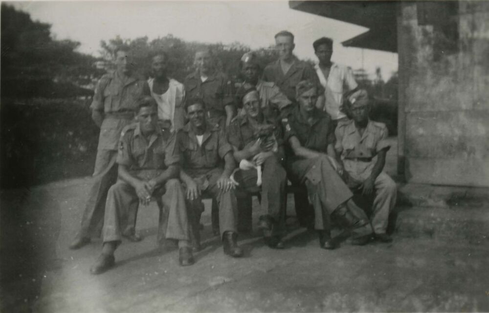 Een portretfoto van zeven militairen van het Bataljon Friesland. Hun namen zijn niet bekend. Eén van hen heeft een hond op zijn schoot. Een viertal inlanders laat de gelegenheid niet aan hun neus voorbij gaan en laten zich eveneens op de gevoelige plaat vastleggen. Op 26 oktober 1945 hield het Bataljon Friesland haar afscheidsparade op het Wilhelminaplein te Leeuwarden. De lange en verre reis naar Nederlands Indië begon tijdens de nacht van 7/8 november 1945. Er werd per trein vanuit Deventer vertrokken en via Calais en Dover bereikte men het kamp Easthampstead ten Zuiden van London. De zeventiende scheepten de manschappen zich in op de 'Johan van Oldebarneveldt'. In het Suezkanaal werd Sinterklaas gevierd en via de Rodezee, de Golf van Aden en de verkoelende Indische Oceaan, werd Singapore bereikt. Hier arriveerde men op de 23e december. Tweede kerstdag vertrok het troepenschip naar Penang, een eiland voor de kust van Malakka. Op dit schiereiland vond een laatste training plaats en kon de taak van het Bataljon, het handhaven van rust en orde in het overzeese gebiedsdeel, beginnen. Bron: Digitaal archief van de Leeuwarder Courant. Een brief van Emile. Gepubliceerd 9 februari 1946. Tijdens de periode 22 oktober 1945 - 10 september 1949 publiceerde de krant meerdere artikelen over het bataljon.