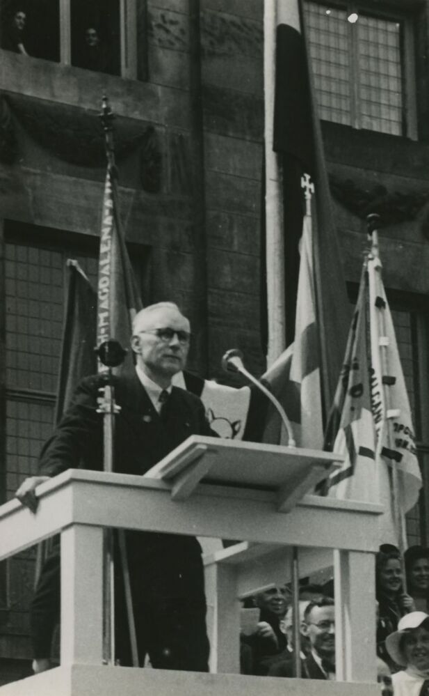 Op vrijdagavond 4 mei 1945 gaven alle Duitse legers, inclusief het in Nederland aanwezige 25e leger, zich over aan veldmaarschalk Montgomery. Hoewel enkele Geallieerde eenheden Amsterdam verkenden, duurde het eerst tot 8 mei, dat de bezetters de wapens neerlegden. Tijdens het machtsvacuum, dat daardoor ontstond deed zich op 7 mei een schietincident voor op de Dam. Hierbij vielen 22 doden en meer dan 100 gewonden. Via de Berlage brug rolde de Canadese hoofdmacht op 8 mei de hoofdstad binnen. De bevrijding was daar. Op vele plaatsen barsten de feesten spontaan los. Na vijf jaar was de Duitse bezetting ten einde. Op woensdag 9 mei hield prof. Gerbrandy tijdens het bevrijdingsfeest op de Dam een toespraak. Hier ziet men hem tijdens de redevoering.