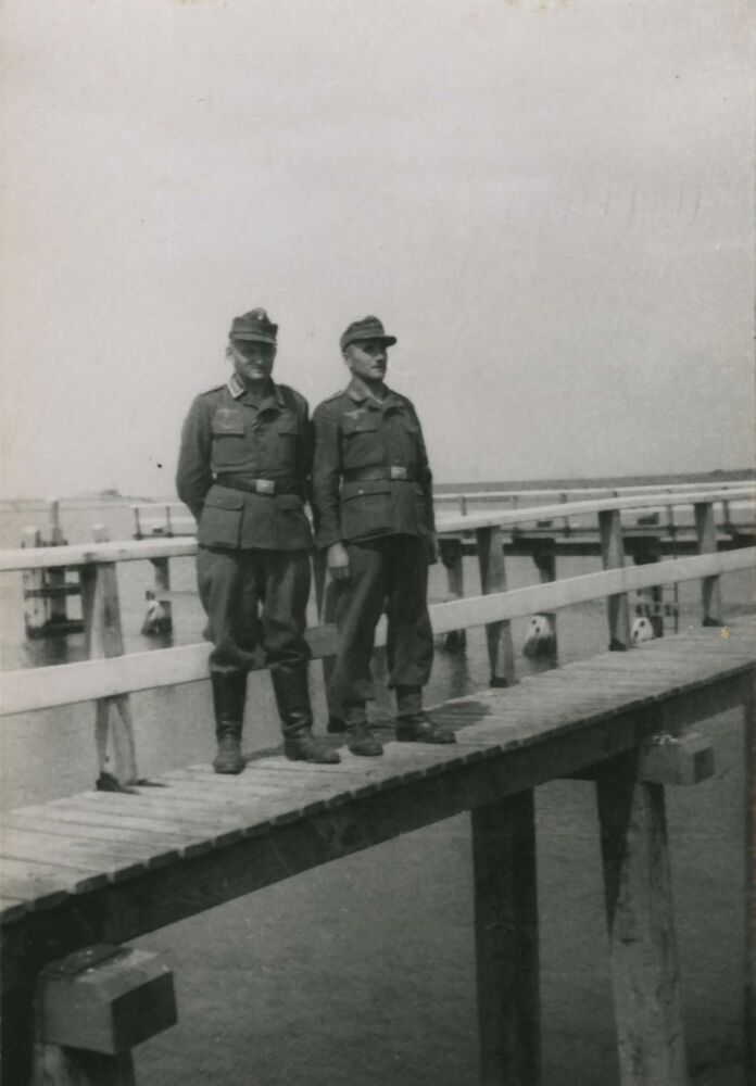 Na de capitulatie, deze werd op 15 mei 1940 door Generaal Winkelman in Rijsoord getekend, kwam Nederland vijf jaar onder Duits gezag te staan. Toch ging het dagelijks leven voor zo goed en kwaad als het ging, niet alleen voor de Nederlanders, maar ook voor de bezetter door. Hier poseren twee Duitse militairen bij de sluizen van Harlingen voor de fotograaf.