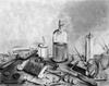 Potloodtekening, een stilleven met hoed, paraplu en tas.