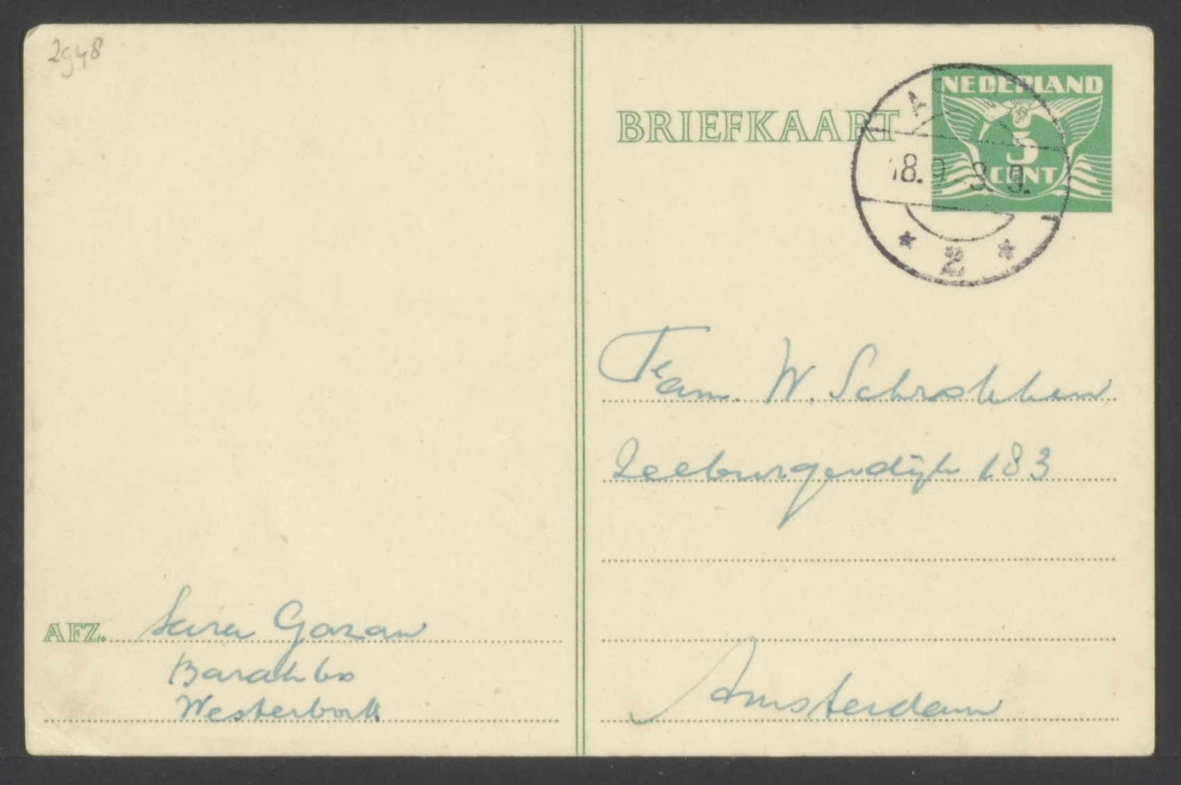 Briefkaart van Sara Gazan aan W. Schokker vanuit kamp Westerbork