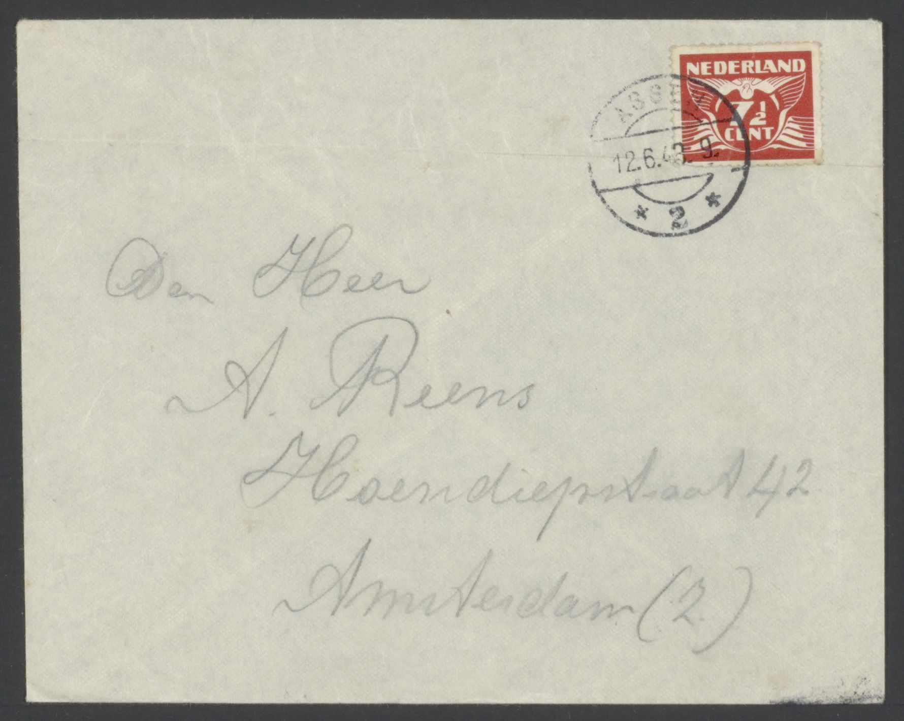 Adres op enveloppe: De heer A. Reens, Hoendiepstraat 42, Amsterdam (Z). Afzender: D. Reens-de Jonge Urbach, Westerbork-Hooghalen, barak 57 Poststempel: Assen, 1943-06-12 aan haar zoon Abraham.