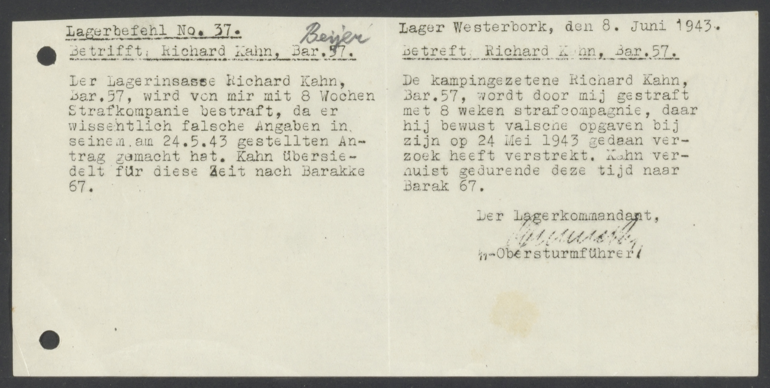 Lagerbefehl No. 46 Datum: 1943-08-25 Plaats: Westerbork, kamp Verlof; nieuw dienstbereich