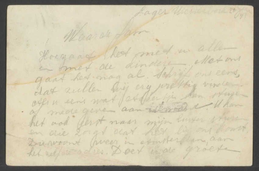 Van: B. van Spier-de Jong Aan: Booy-Sukkel, Fam. Plaats: Westerbork, kamp Datum: 1943-07-23 Onderwerp: omstandigheden