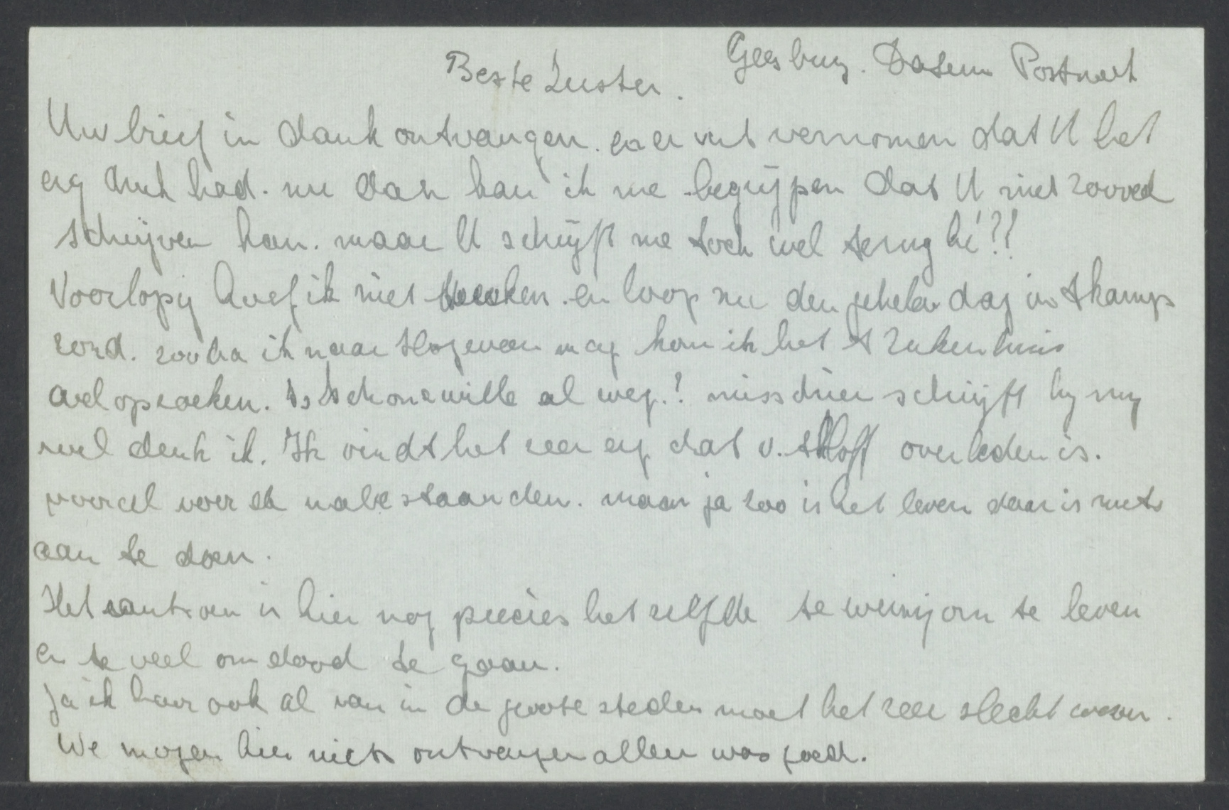 Van: Praag, van, Alice Aan: Velden, van de, J. Plaats: Den Haag Datum: 1943-04-10 Onderwerp: Afscheid nemen; Op transport naar Vught. Ouders waren op 14 april al doorgestuurd. ‘Wij gaan voorlopig naar Vught, de ouders naar Polen’.