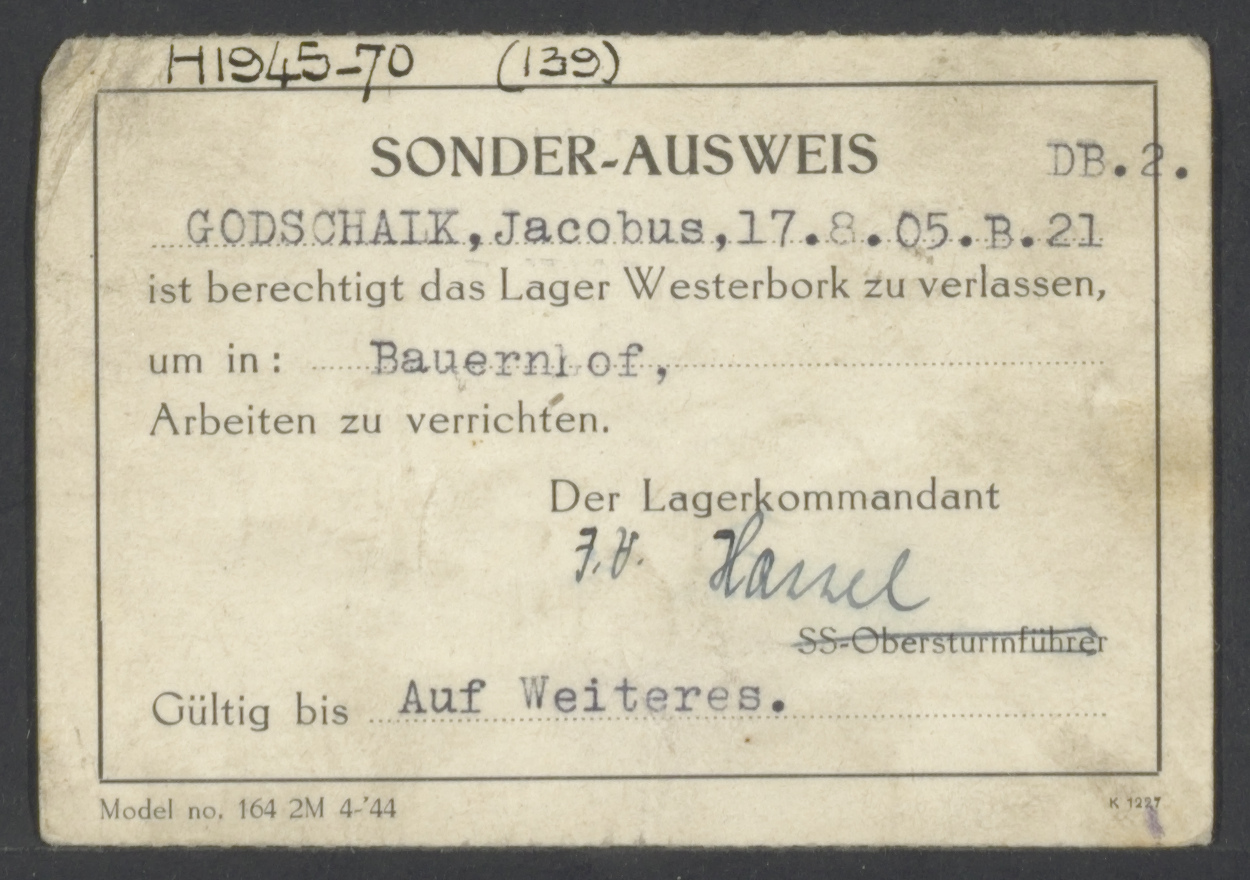 Sonder-Ausweis Godschalk, Jacobus, 17-8-05, B21 ist berechtigt das Lager Westerbork zu verlassen, um in: Bauernhof Arbeiten zu verrichten (DB 2). Gültig bis: Auf Weiteres