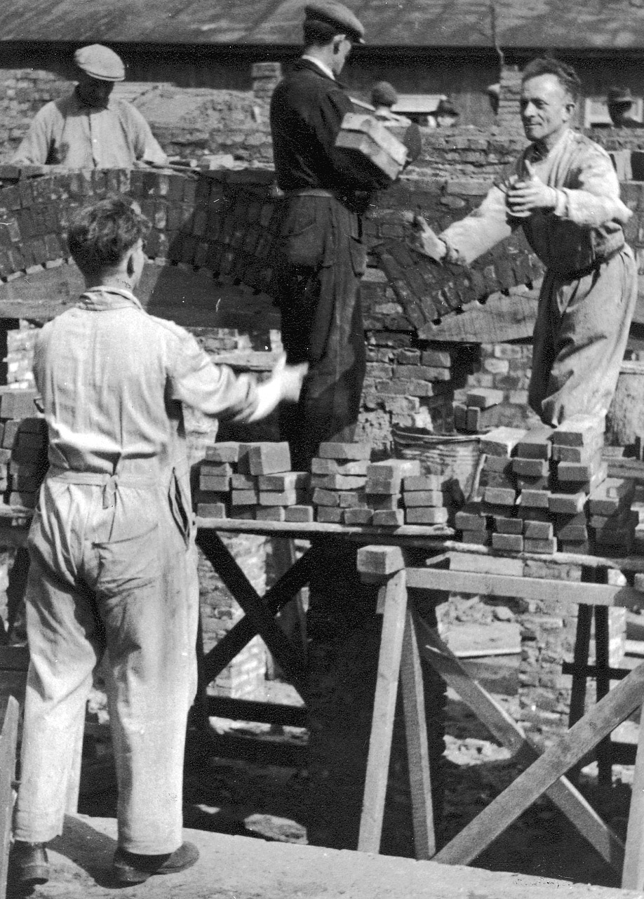 Breslauer, W.R. De bouw van de Reinwaterkelder in het doorgangskamp. Op de achtergrond is de centrale weg van het kamp te zien; de kop van barak 99 en de voorkant van barak 100. Kamp Westerbork, jaartal onbekend.