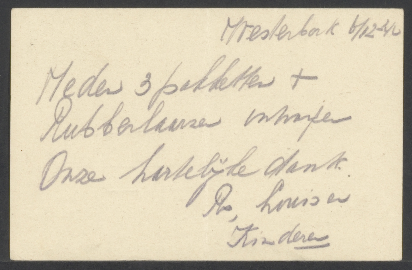 Van: Stranders-Hartog, Rosette, de Aan: Gosschalk, J. Datum: 1942-12-06 Plaats: Westerbork, kamp, barak 36 Onderwerp: drie pakketten en rubberlaarzen ontvangen. Dank…