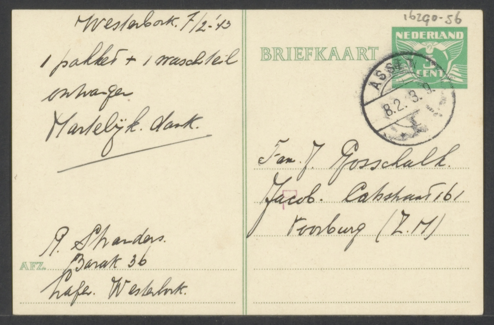 Van: Stranders-Hartog, Rosette, de Aan: Gosschalk, J. Datum: 1943-01-10 Plaats: Westerbork, kamp, barak 36 Onderwerp: twee pakketten ontvangen. Dank.