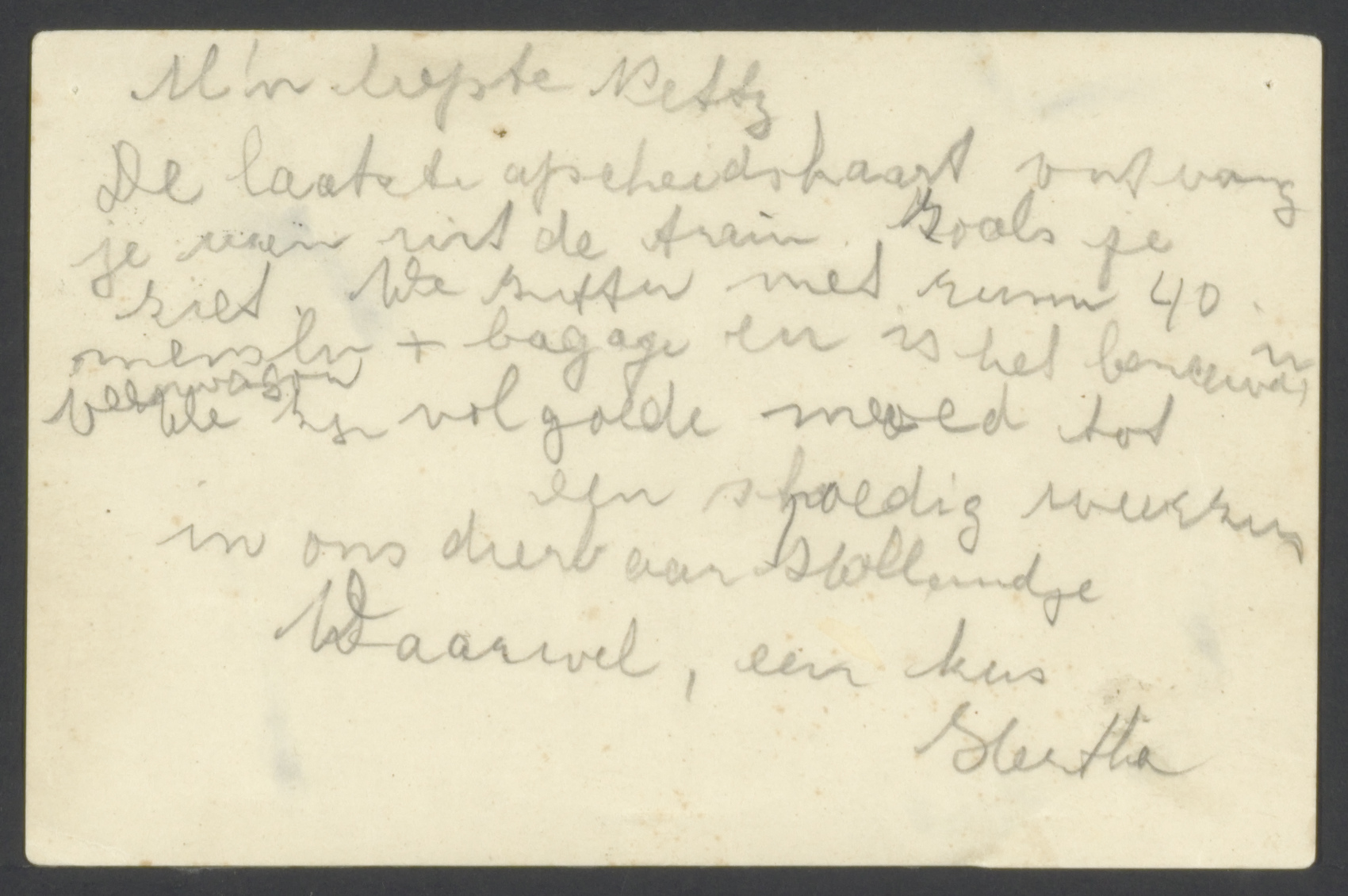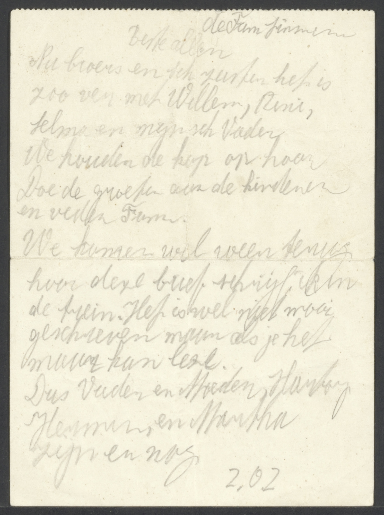 Van: Simmeren, Willem Aan: Simmeren, familie Datum: 1942-10-23 Plaats: trein op weg naar Auschwitz Onderwerp: afscheidsbriefje vanuit de trein gegooid. Behalve het gezin van de schrijver gaat ook zijn schoonvader mee. ‘We houden de kop op hoor!’… ‘Alles komt terecht!’