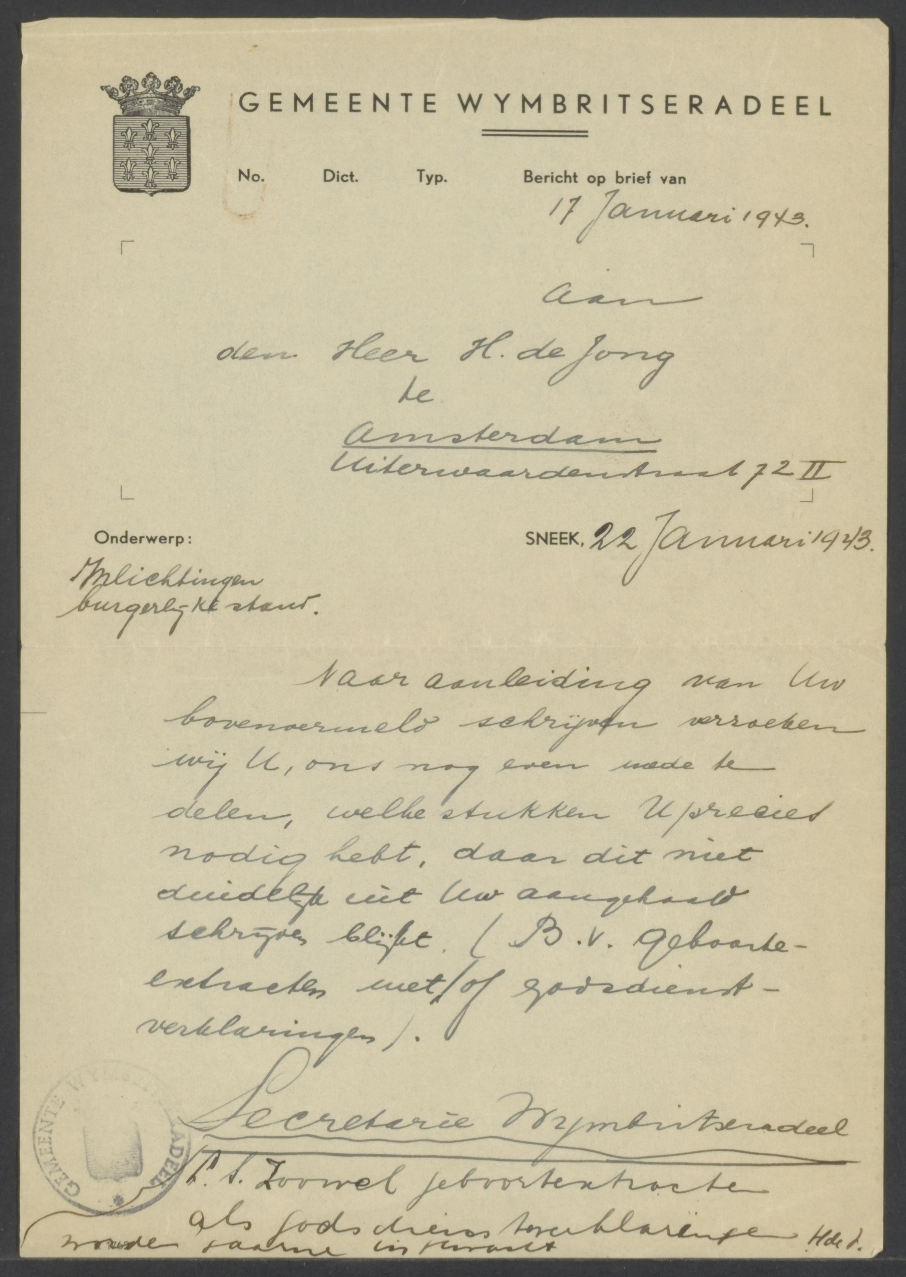 Verzoek Van: Gemeentesecretarie Wymbritseradeel Aan: Jong, de, H. Datum: 1943-01-17 Onderwerp: verzoek om door te geven welke stukken uit de burgerlijke stand de heer De Jong nodig heeft (geboorteakten en godsdienstverklaringen)