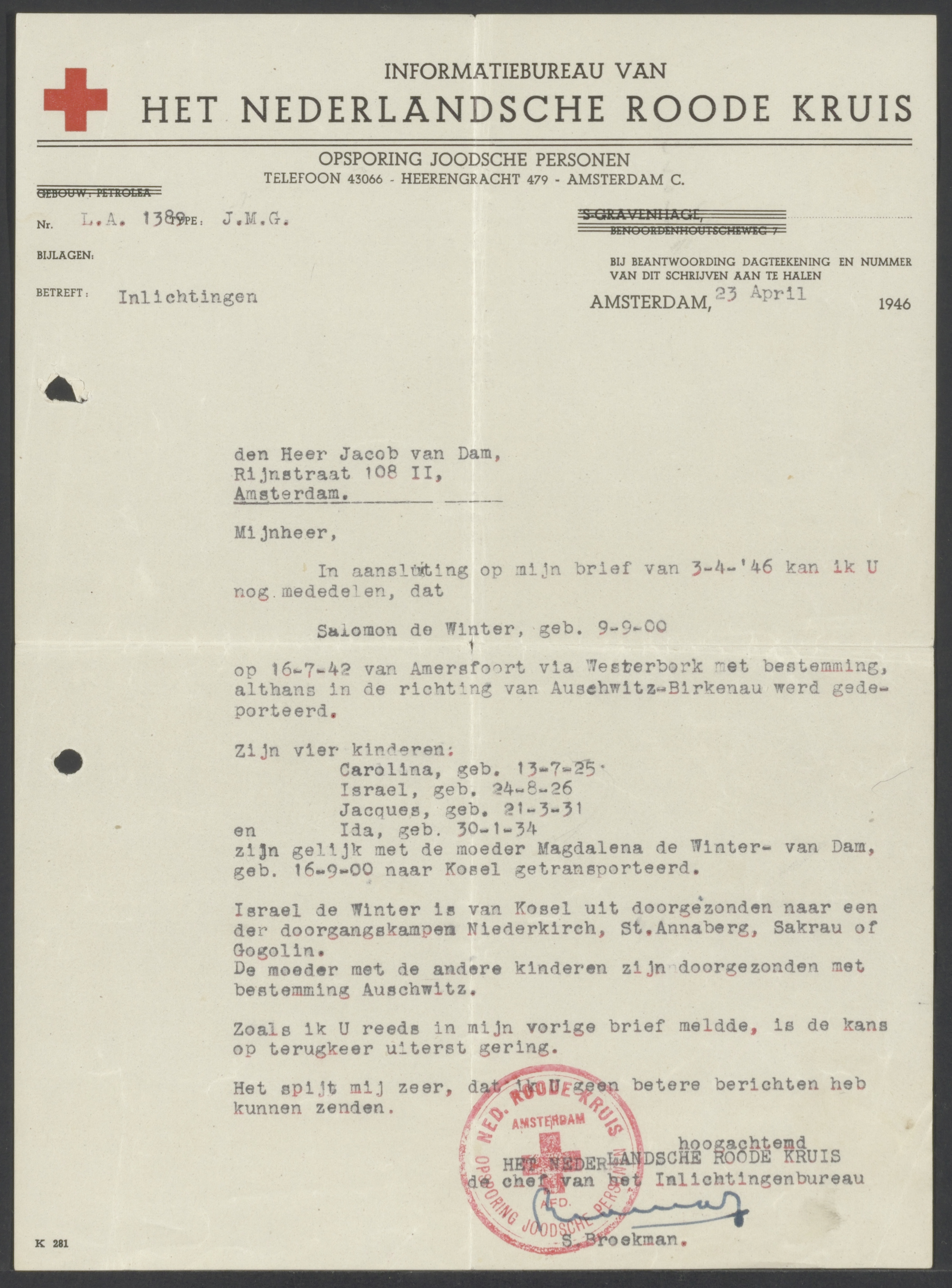 Van: Het Rode Kruis, Informatie Bureau Aan: van Dam, Jacob (broer van Joseph/Jaap) Plaats: Amsterdam Datum: 1946-04-23 Onderwerp: het lot van het gezin de Winter-van Dam. Moeder en kinderen zijn naar Auschwitz doorgestuurd en vader is in het plaatsje Cosel uit de trein gezet om verder te worden doorgestuurd.