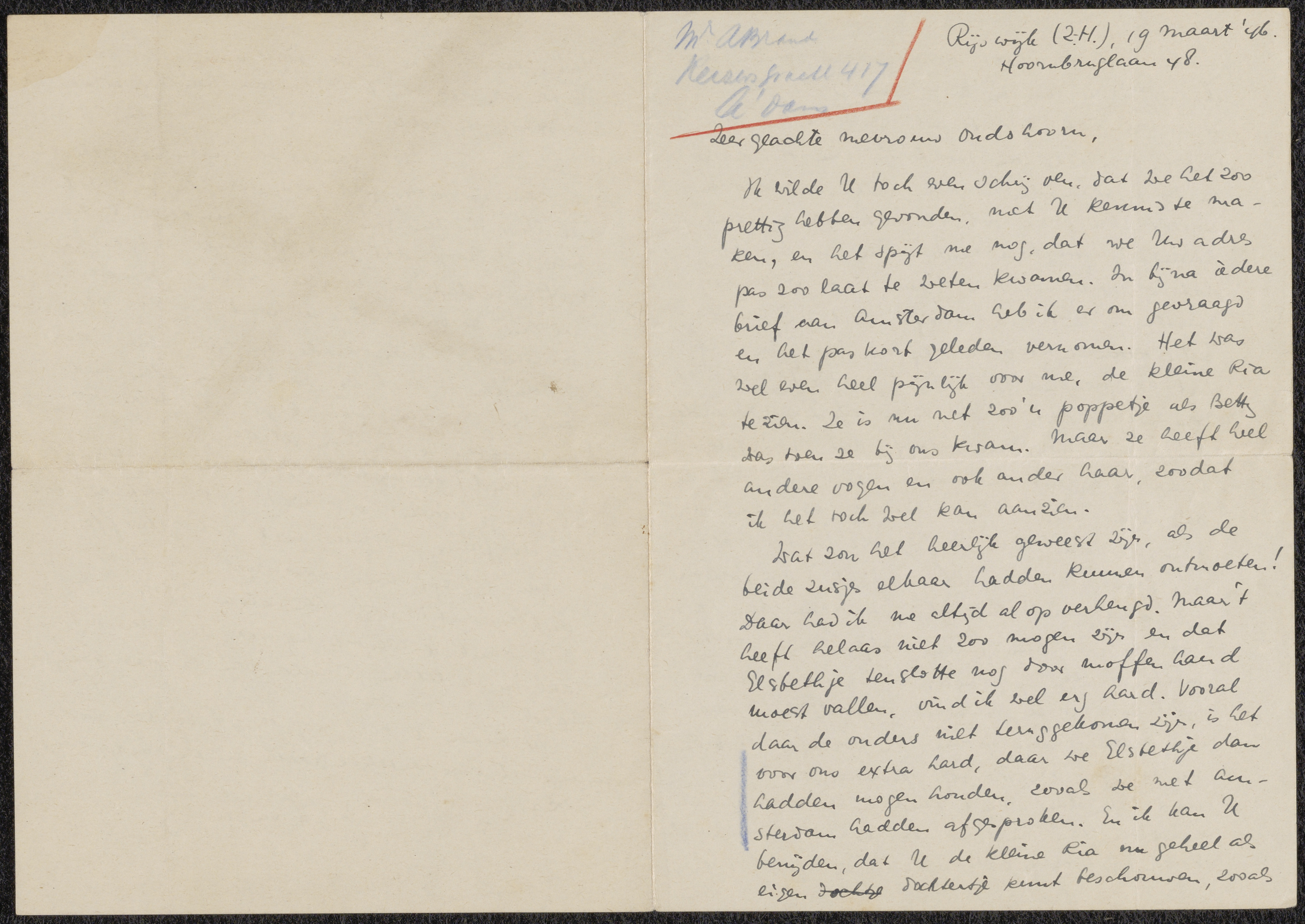 Van: onbekend Aan: mevrouw Querido Plaats: onbekend Datum: 1943 Onderwerp: moed houden; met verschillende personen onder code namen Knol, Duifje…maken het goed.
