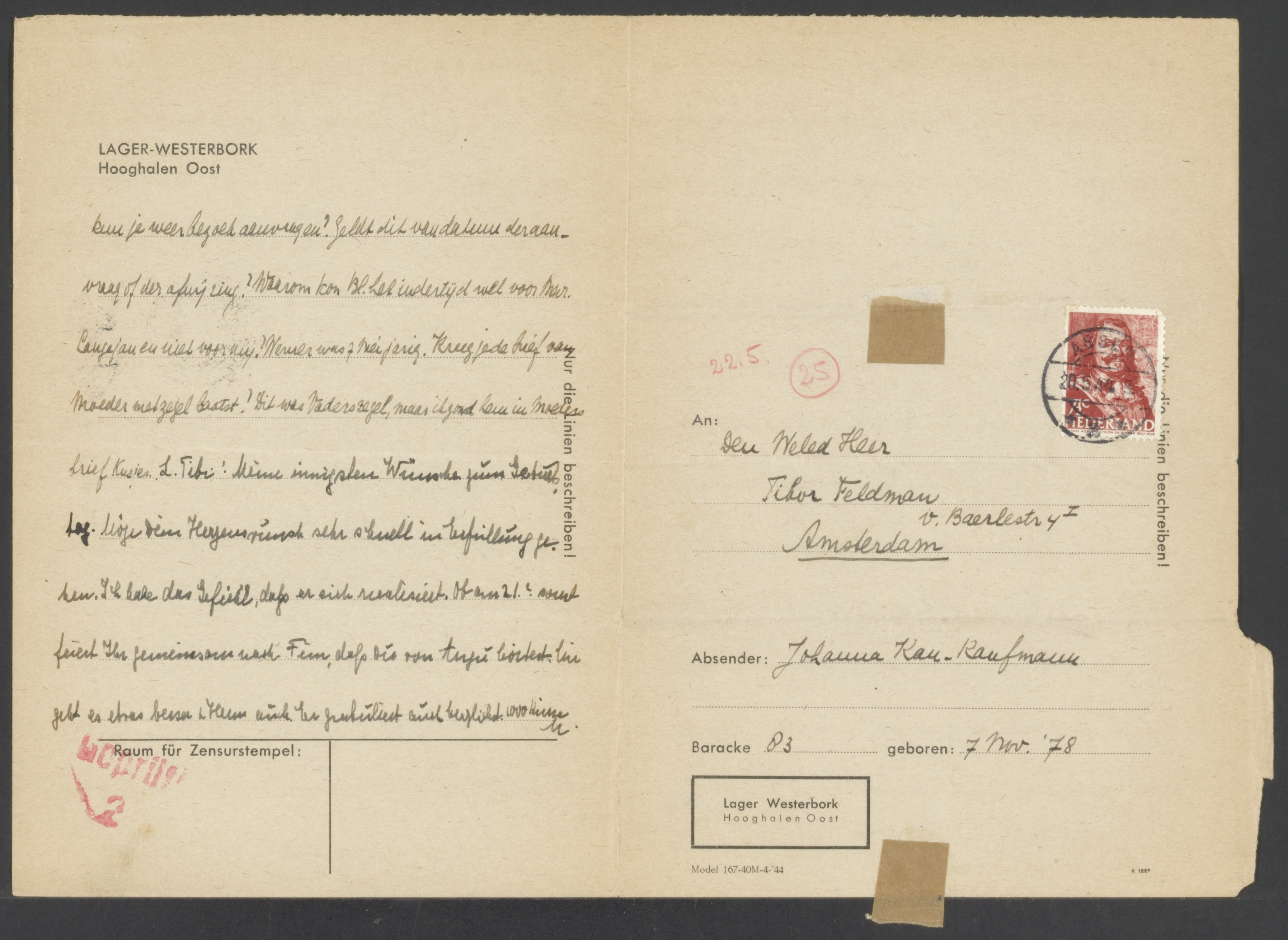 Van: Feldman-Kan, Lotte Ruth (en Johanna Kan-Kaufmann) Aan: Feldman, T. Plaats: Westerbork, kamp Datum: 1944-07 Onderwerp: vele kaarten komen niet terecht; ze heeft in het kamp een stofbril gekocht; ze zingt soms. Ze red het wel…