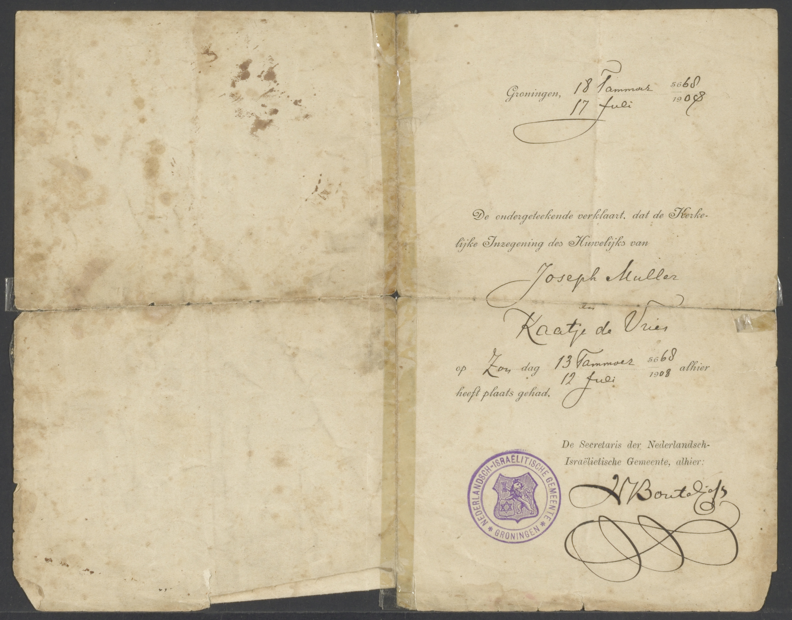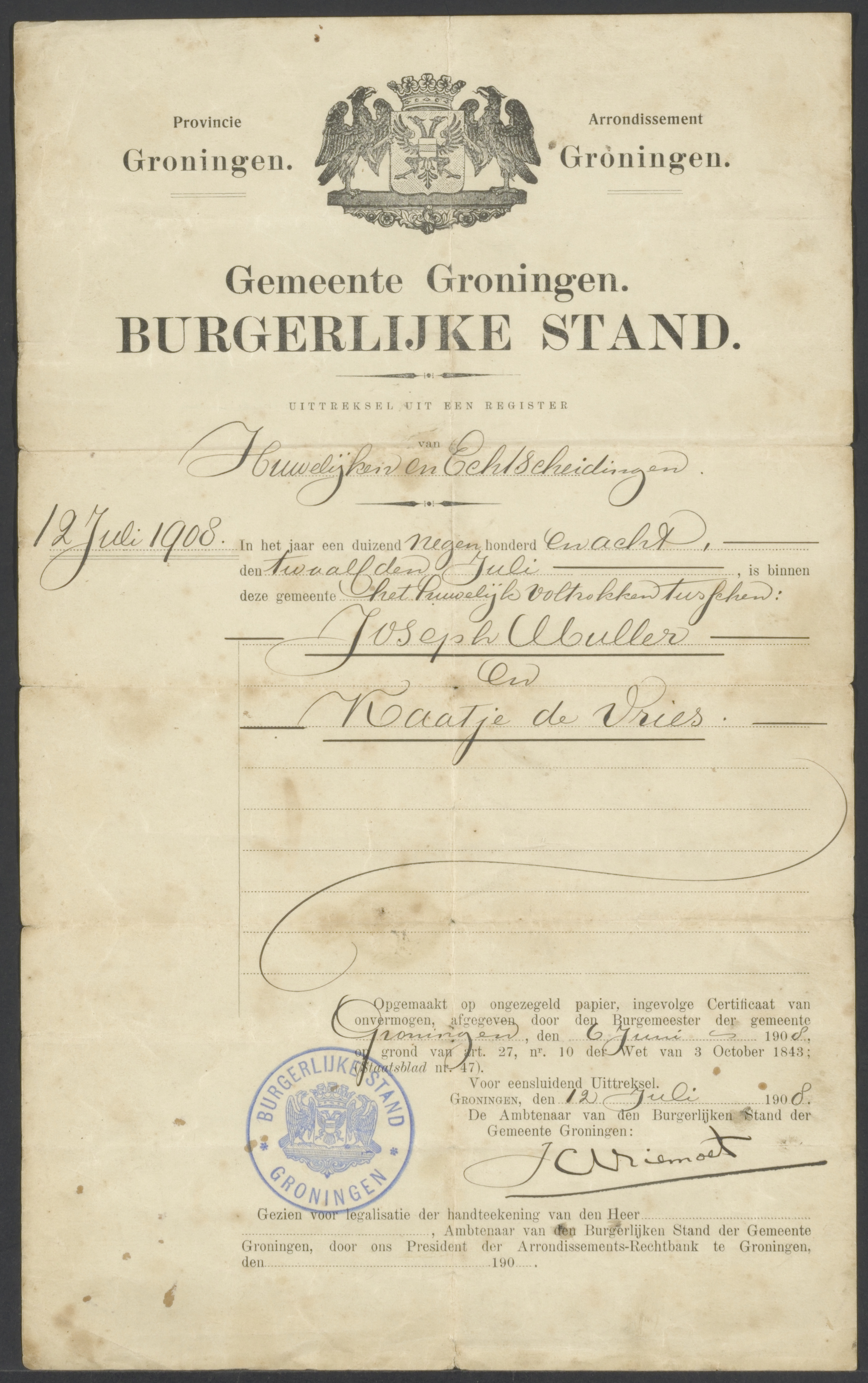 Van: de Burgerlijk Stand Groningen Aan: Muller, Joseph en de Vries, Kaatje Plaats: Groningen Datum: 1908-07-12 Onderwerp: bewijs van huwelijks-vereniging.