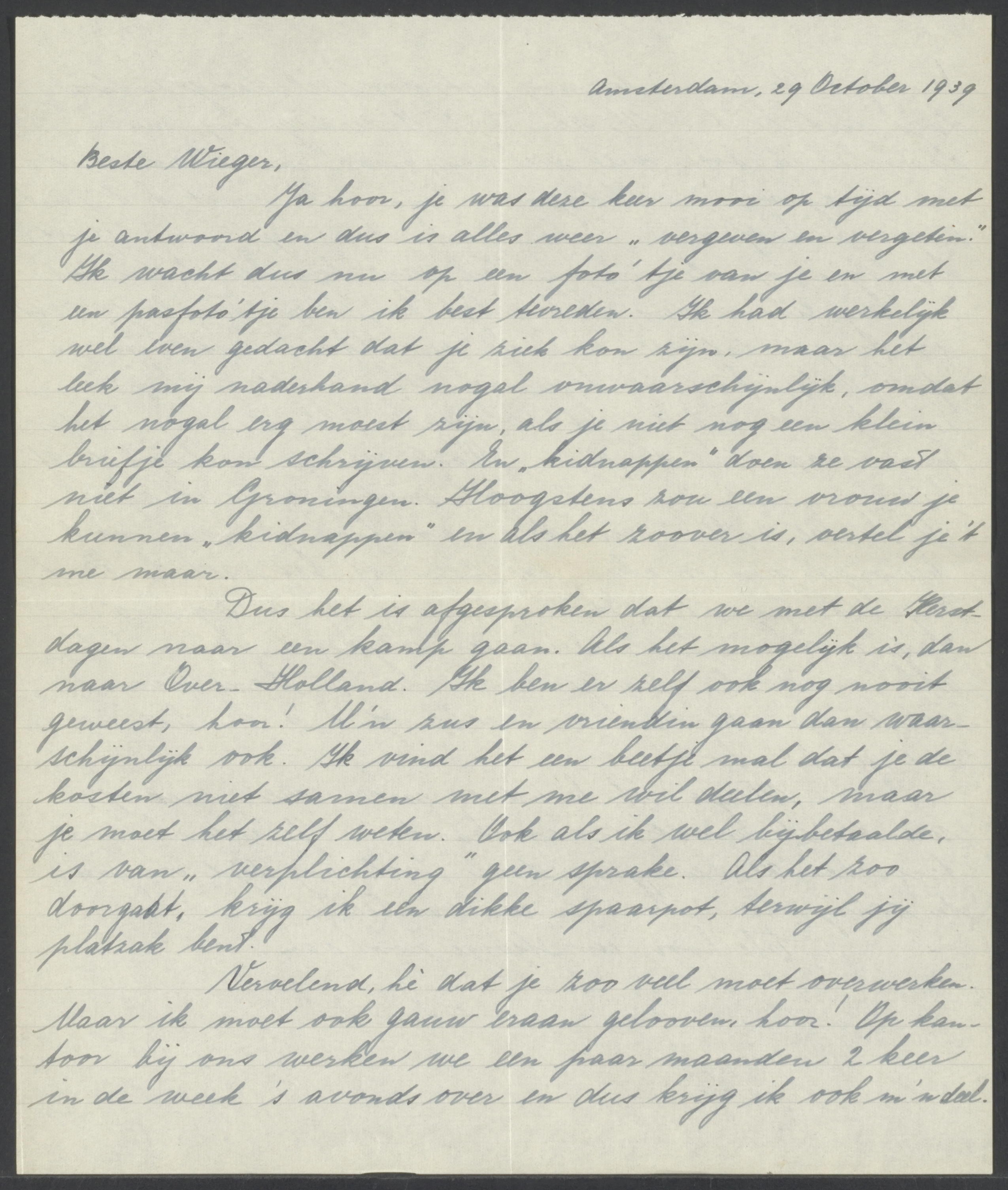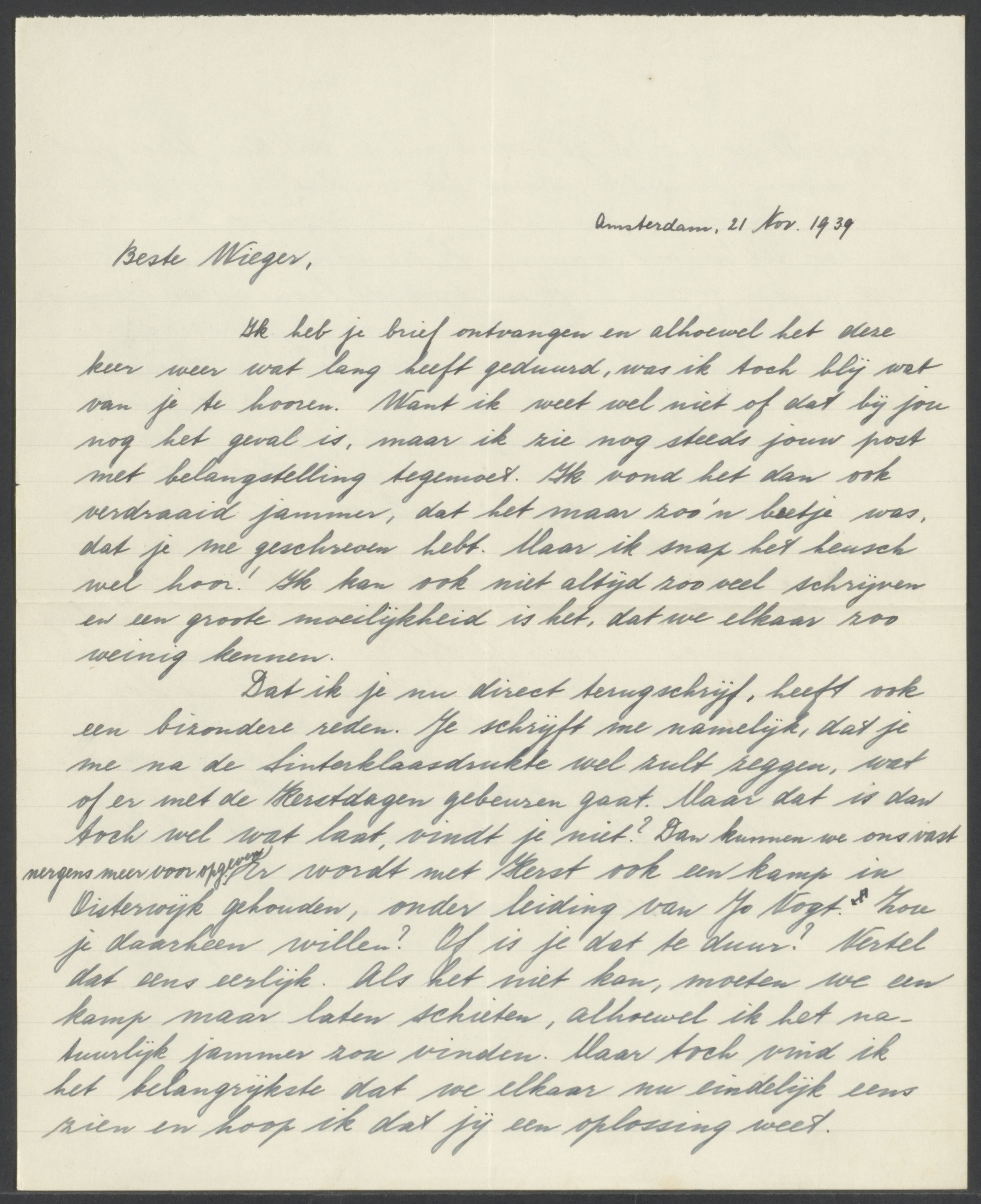 Van: Mouw, Saar Aan: Wieger Plaats: Amsterdam Datum: 1939-10-22 Onderwerp: een brief gekregen; na 14 dagen heeft Wieger weer iets van zich laten horen; niet schrijven als je het als een verplichting voelt; de knoop doorhakken?; het weekend is niet door gegaan, misschien met Kerst 'als je nog iets voor mij voelt’?; met Kerst gaat ze nu naar een kamp van de Natuurvrienden. Ze vraagt aan Wieger of hij dan ook komt? financieel kunnen ze het verschil delen. Ze wil zelf er ook een paar dagen uit, dus voor haar is een bezoek van Wieger aan Amsterdam niet direct een optie meer; haar reactie als ze een uitnodiging had gekregen voor de bruiloft van Wieger zijn broer…