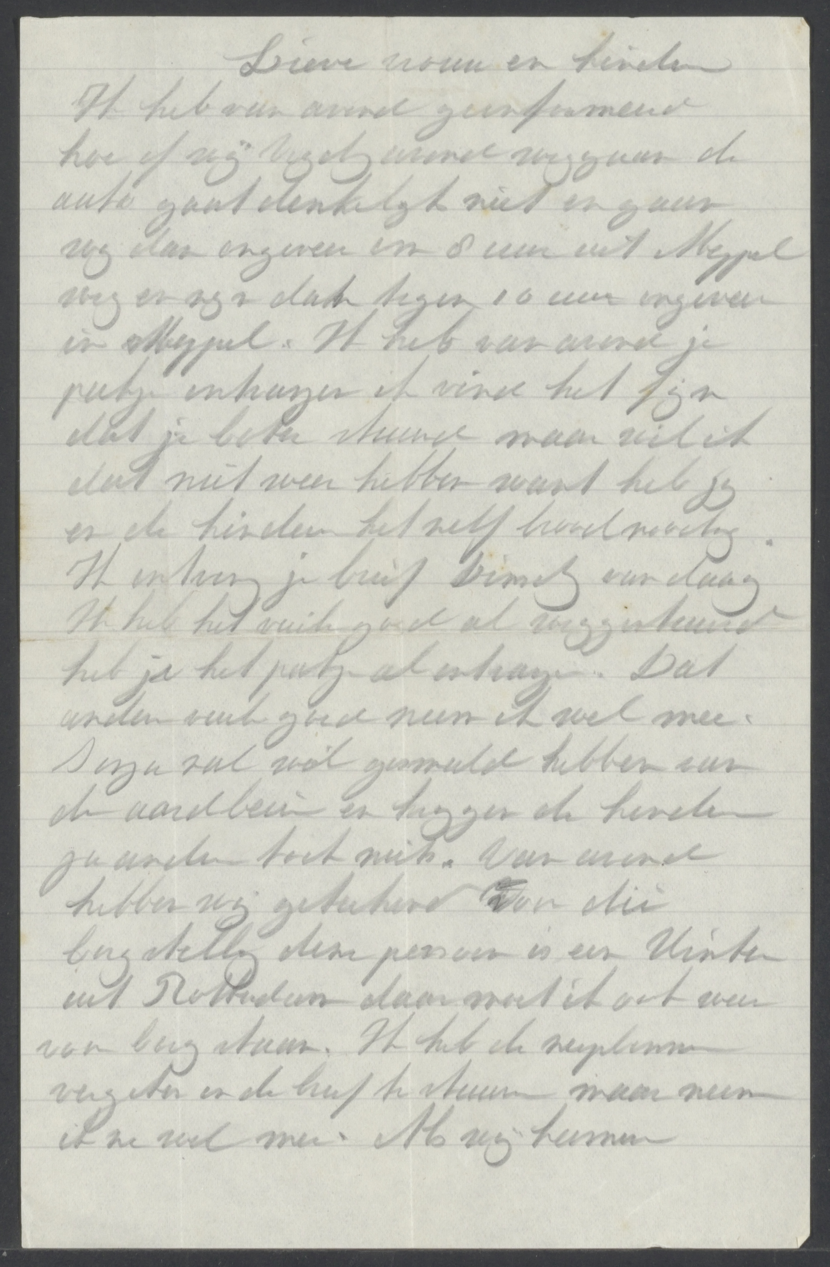 Van: de Groot, Samuel Aan: zijn vrouw en kinderen Plaats: Havelte, Joods werkkamp Datum: 1944 Onderwerp: Samuel zit aan tafel en heeft even rust; ze zijn nog steeds aan het zandstorten en rail aan het verplaatsen; het werk kan nog maanden duren; ze moeten in de zaal verschijnen om verschillende dingen op te halen en misschien ook geld; hij heeft vandaag niet hard gewerkt, maar is net zo moe als gisteren; zoeven zijn geld gehaald, na aftrek van de kosten voor het eten bleef er 2,31 over, een voorschot werd niet verstrekt; er gaan geruchten dat ze met de Paasdagen met verlof gaan; hij zal vuile was in een pakje toesturen; op het terrein in Havelte werken 3000 arbeiders; het terrein is enorm. Je hebt niet in de gaten dat zoveel mannen er werkzaam zijn…