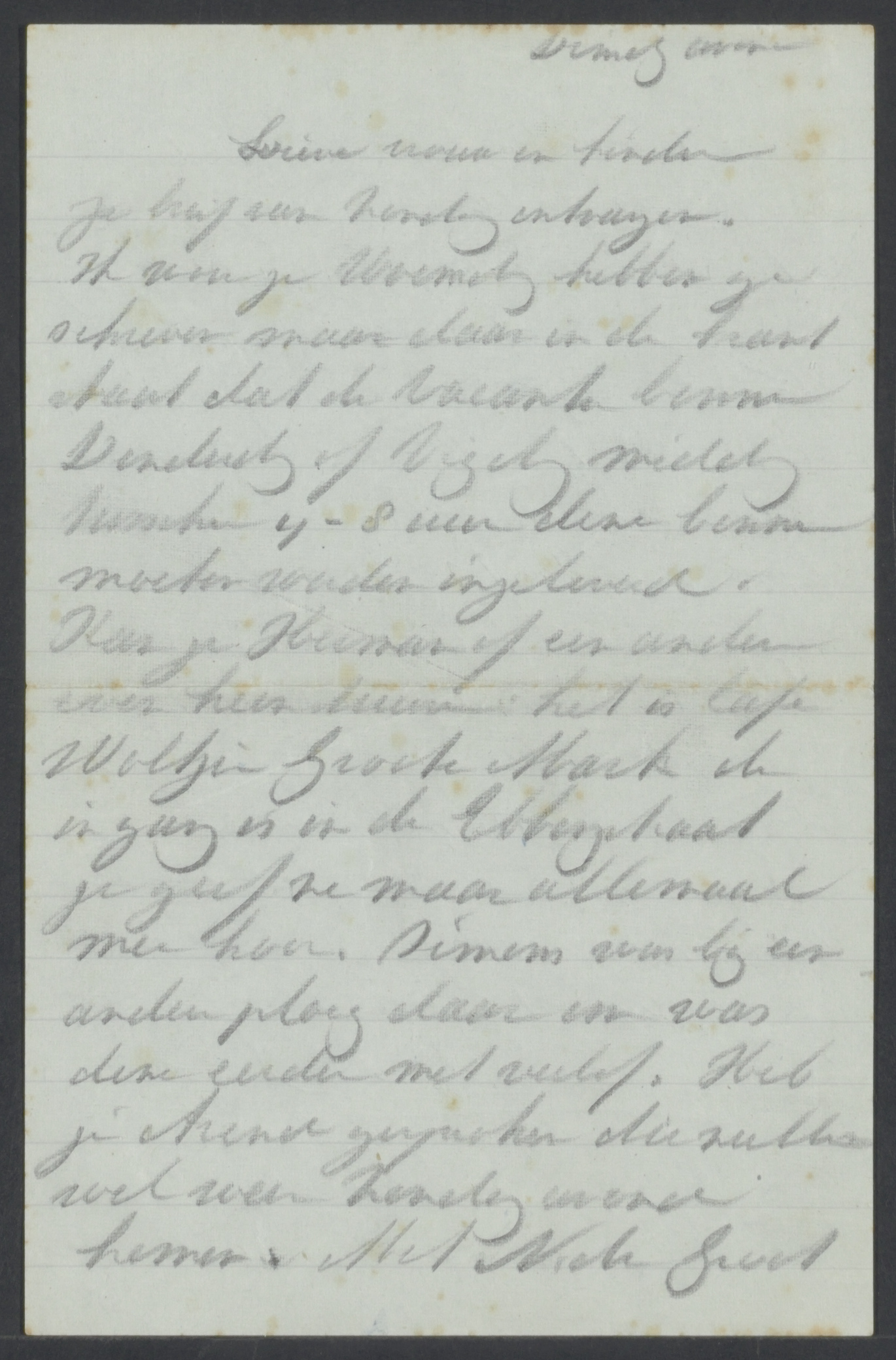 Van: de Groot, Samuel Aan: zijn vrouw en kinderen Plaats: Havelte, Joods werkkamp Datum: 1944 Onderwerp: Simon Berkelo was bij een andere ploeg en daardoor een week eerder met verlof; als Salomon verlof krijgt zal hij zaterdag om 8 uur in Groningen zijn…