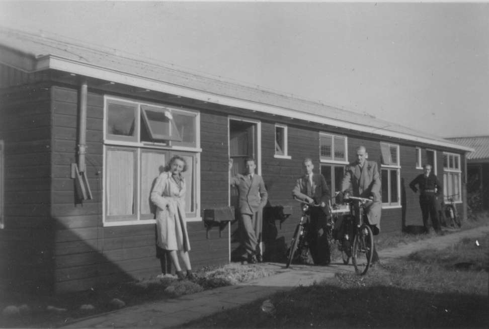 Foto met personeelsleden van het Interneringskamp. Plaats: Westerbork, Interneringskamp Datum: 1947 Op de achterzijde staat genoteerd: Vroegere woonbarak van de heer M. Montezinos. Bekenden: Van Buchen (in deuropening) en Van Blaaderen (met fiets, rechts), links met witte regenjas Hadewich Kraai