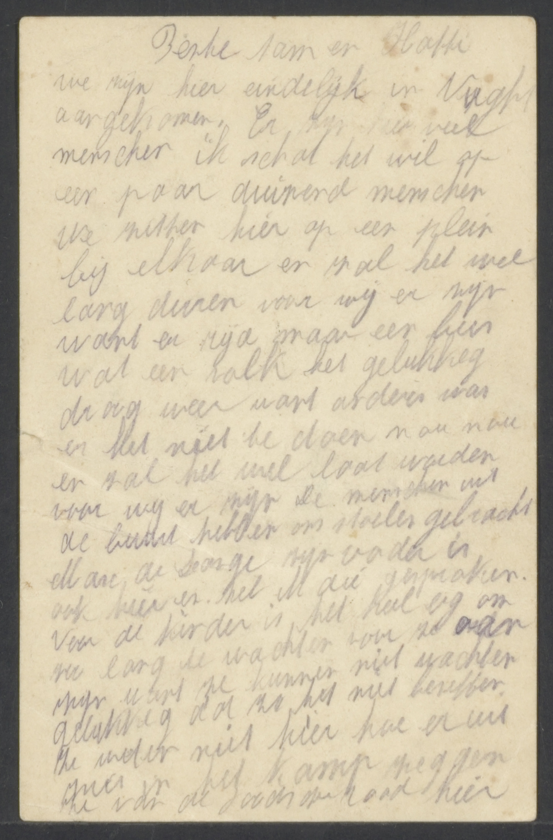 Van: de Groot, Marcus Aan: de Groot, Samuel Plaats: Vught, kamp Datum: 1943-04 Onderwerp: met gezin aangekomen in kamp Vught; er zijn veel mensen, wel een paar duizend; ze zitten op een plein bij elkaar, het zal lang wachten worden; voor de kinderen (Martin en Erich) is het erg; werknemers van de Joodse Raad weten niet hoe het er in het kamp uitziet…