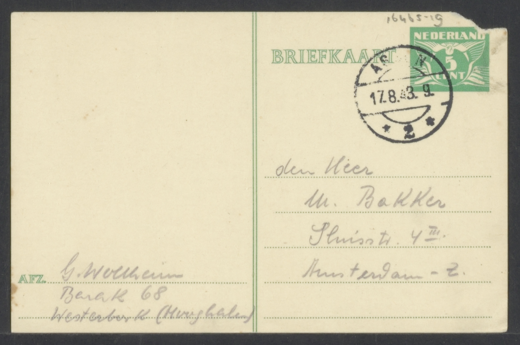 Briefkaart van Günter Wollheim aan de familie Bakker vanuit kamp Westerbork