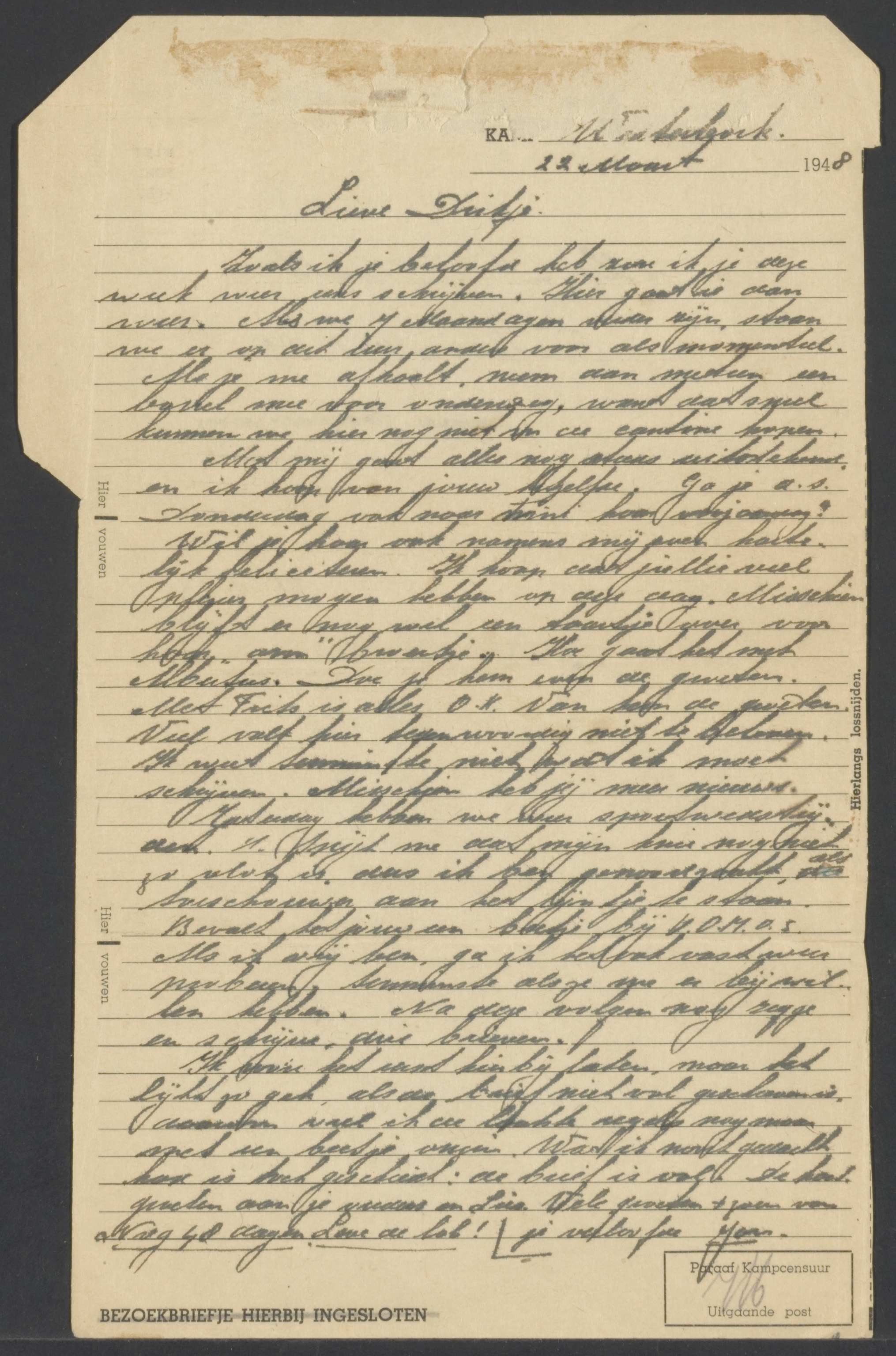 Van: Beijering, Jan Aan: Drenth, Dirkje Plaats: Westerbork, Interneringskamp Datum: 1948-04-27 Onderwerp: voorlaatste brief die ze zal ontvangen (in verband met ontslag uit het kamp van Jan); hij voelt zich belabberd in verband met het moeten verschijnen voor het Tribunaal; nog 12 dagen en alles is voorbij…; hoe gaat het met Frits? (die weer thuis is); in het kamp is niets bijzonders te beleven; …iemand komt op bezoek bij haar vader die in het kampziekenhuis ligt…