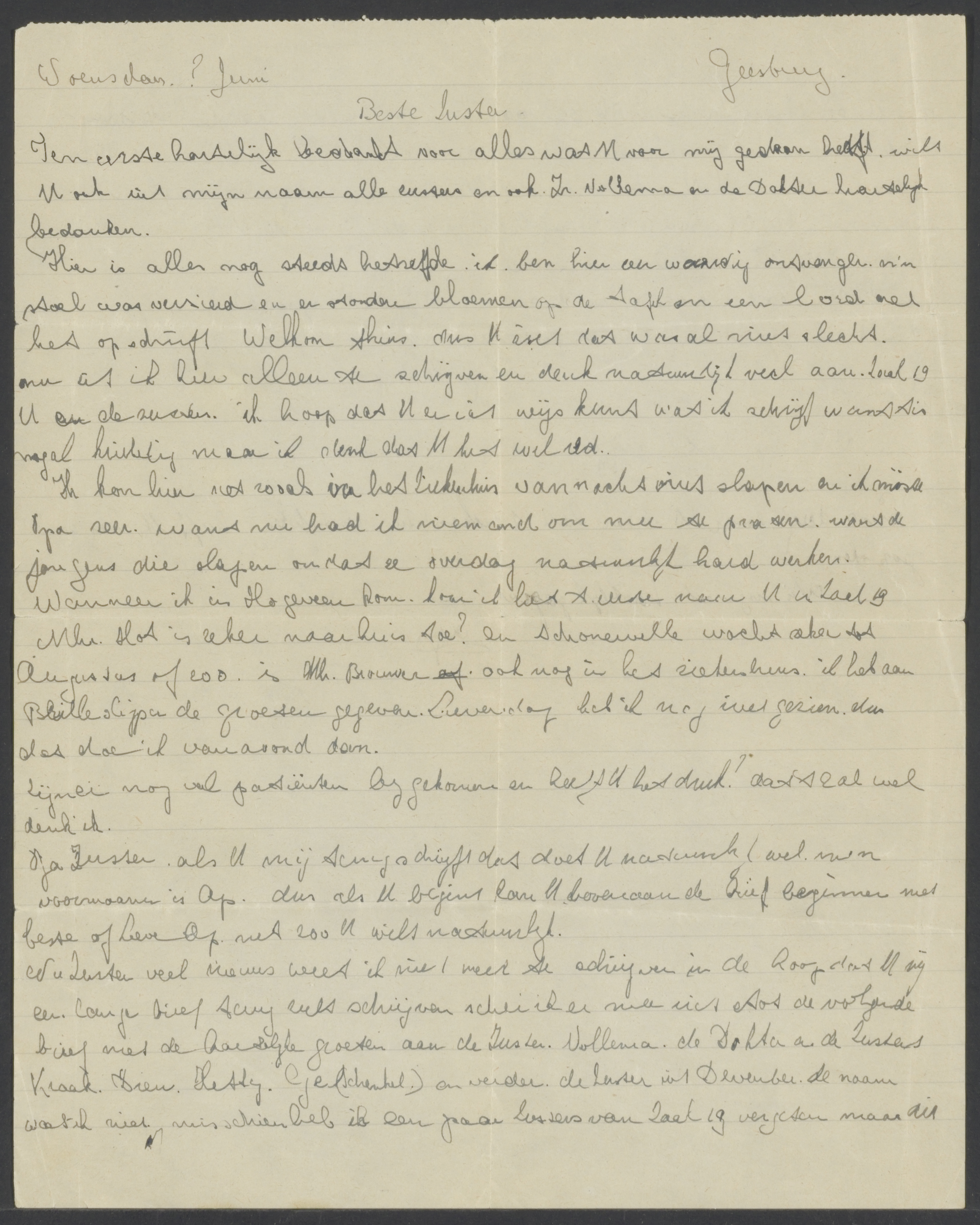 Van: Ereira, B. Aan: van Hulstijn, zuster Plaats: Kremboong, Joods werkkamp Datum: 1942 Onderwerp: over zijn werkschoenen…; hij weet zeker dat hij ze in het ziekenhuis heeft achtergelaten; hij mist in het kamp de vogels, de bomen…hij smacht erna dat hij weer kan lopen en werken, dan komt hij tenminste weer in de natuur; wat het eten betreft kopen ze alles wat maar te krijgen is, het rantsoen in het kamp is verlaagd; hij sluit bij de brief het kamplied bij…