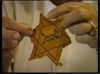 Star of David badge made from yellow cloth with printed black text in centre of star. Stitching along perimeter in black thread.