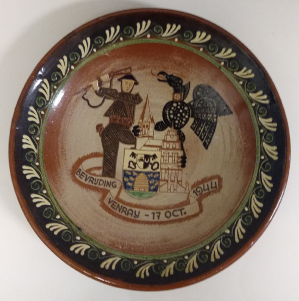 Eikenhouten lijst met daarin twee tegels, die bij elkaar horen. Boventegel, kerktoren met daarnaast afbeelding van Sint Oda, tegel eronder met stuk kerk,boom,latijnse school en wapen van Venray en tekst: Venray verwoest-Venray bevrijd 17-10-1944. in kleuren blauw-geel, groen en gesigneerd Piet Koppens