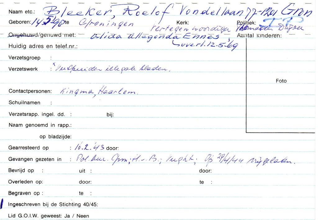 Systeemkaarten met namen van personen uit het verzet: Roelof Weggemans