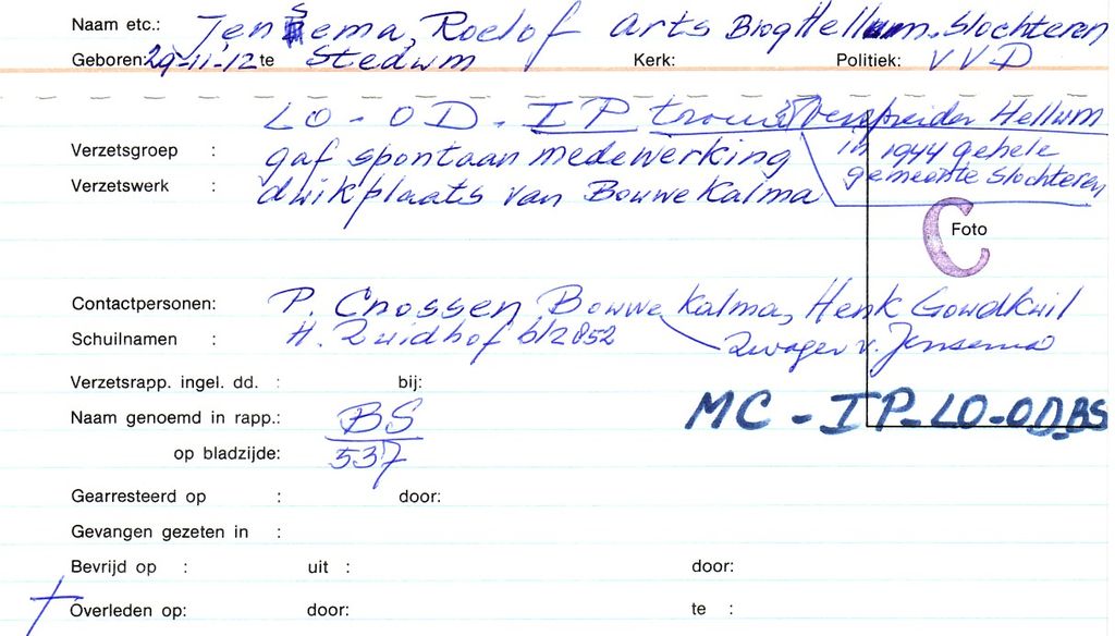 Groep Factoor. Ondergedoken voor de arbeidsinzet bij C. v.d. Berg in Delfzijl. Is meer dan twee maanden in Duitsland werkzaam geweest. Gaf inlichtingen door vanuit de SD, hij had daar een relatie 'in de goede zin'