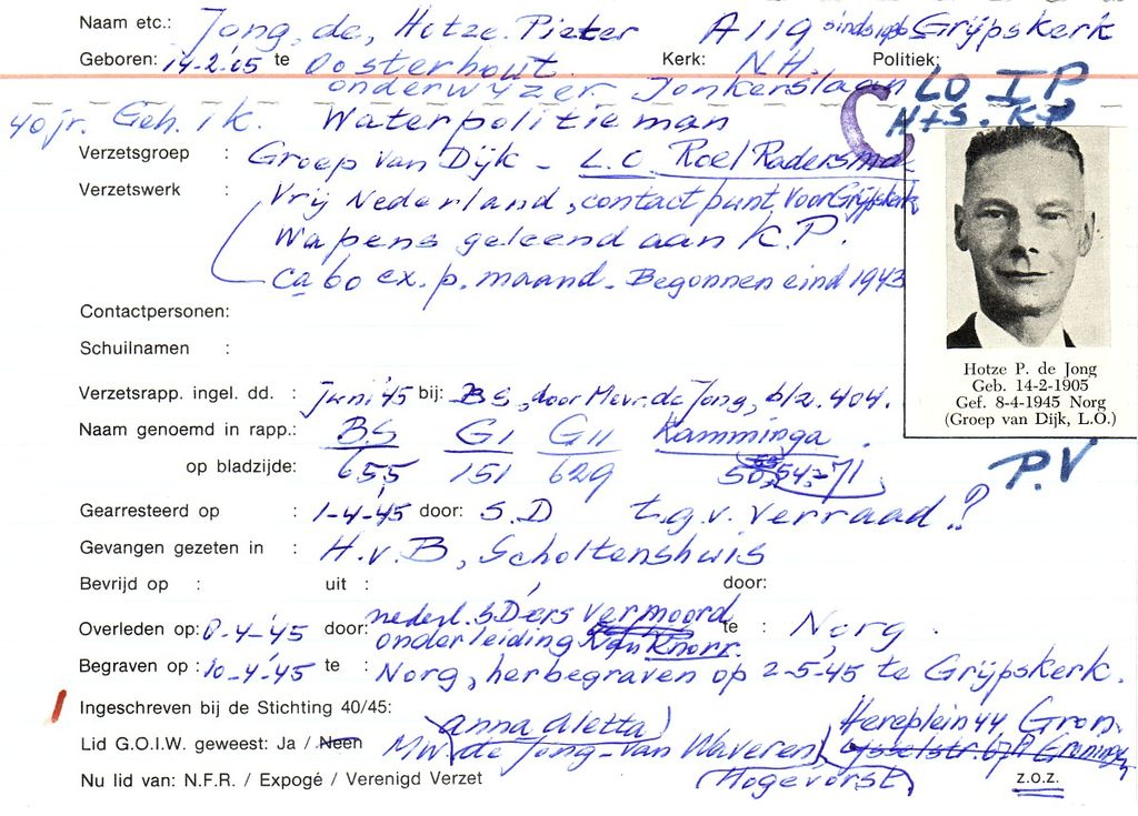 Systeemkaarten met namen van personen uit het verzet: Hotze Pieter de Jong