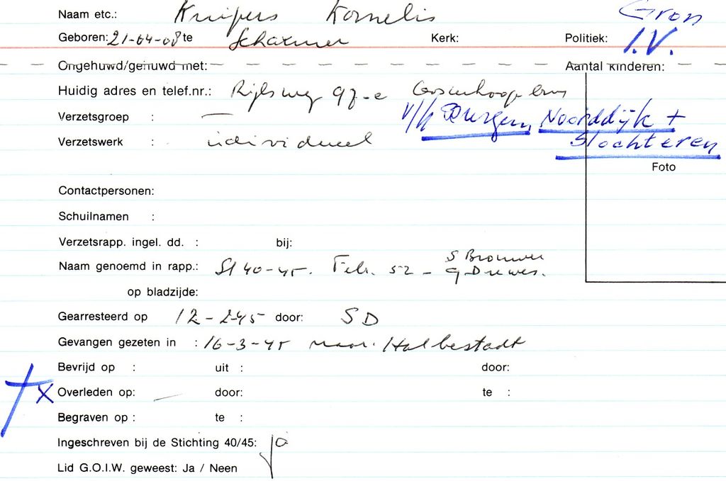 Systeemkaarten met namen van personen uit het verzet: Kornelis Lamain