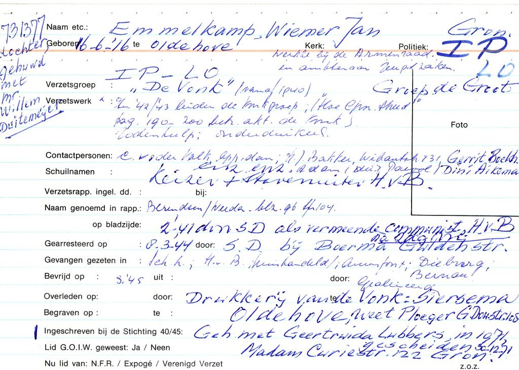 Systeemkaarten met namen van personen uit het verzet: Wiemer Jan Emmelkamp