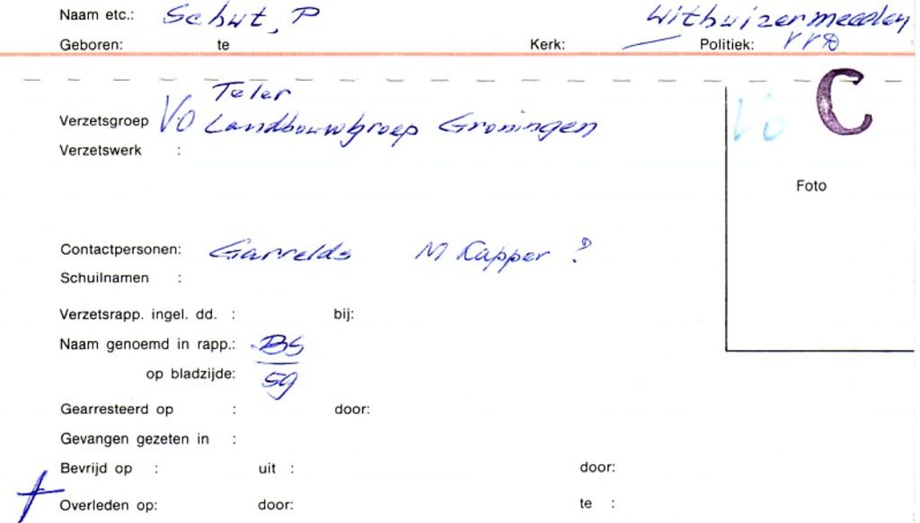 Systeemkaarten met namen van personen uit het verzet: Aldert Schut