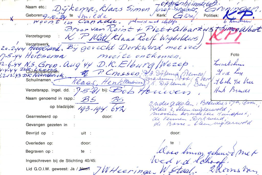 Systeemkaarten met namen van personen uit het verzet: Aldert Klaas Dijkema