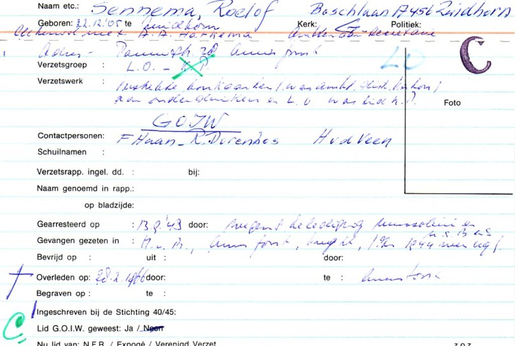 Systeemkaarten met namen van personen uit het verzet: Roelof van Weerden