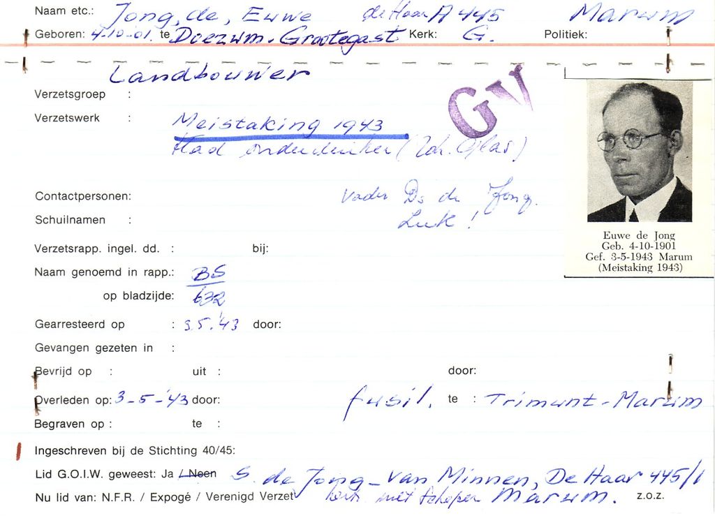 Systeemkaarten met namen van personen uit het verzet: Euwe de Jong